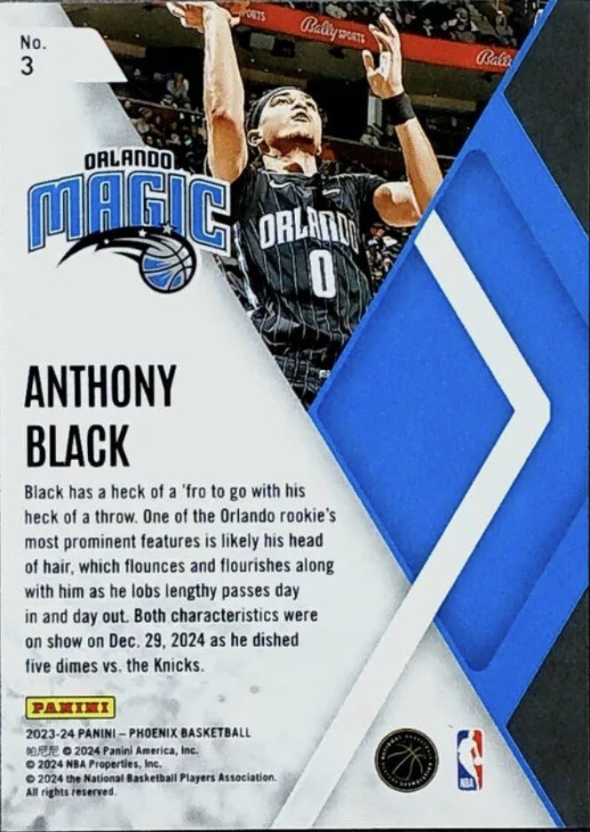 This 2023-24 Panini Phoenix Instant Phenom #3 Anthony Black Magic trading card is a must-have for any basketball fan. Featuring the rookie Anthony Black from the Orlando Magic team, this card is an original and comes from the 2024 Phoenix insert set. The card is made from 20 Pt. card stock and has a standard size. The card is in English language and has a black parallel/variety. It is an insert with a limited print run and is not autographed. The card is not a licensed reprint and was manufactured by Panini in the United States. This card is a great addition to any sports trading card collection and is perfect for fans of the National Basketball Association (NBA).