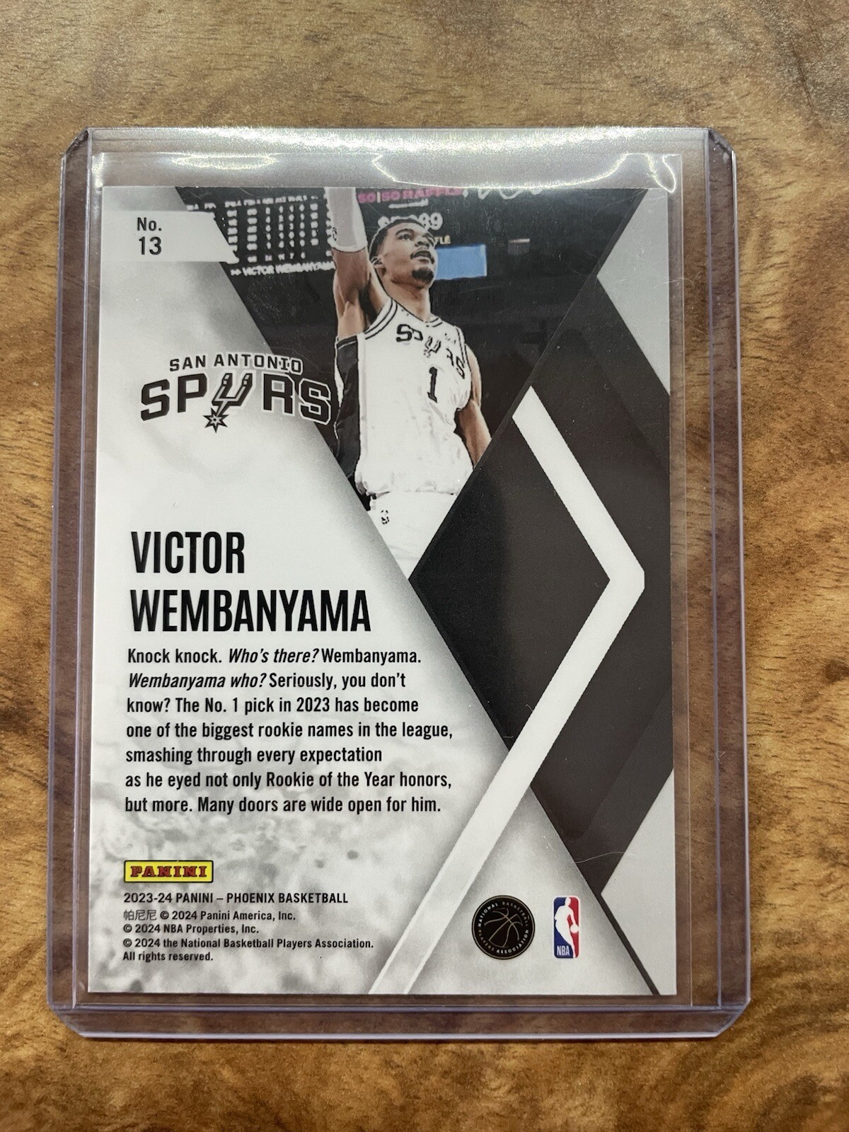 The product is a 2023-24 Panini Phoenix Victor Wembanyama Rookie Card featuring the player from the San Antonio Spurs. This particular card is from the Instant Phenom insert set and has a Red Ice parallel variety, making it a rare and special card. It is a standard-sized trading card made of 35 Pt. card stock, with English language text and manufactured in the United States. With its original design and limited print run, this collectible card is a valuable addition for fans and collectors of basketball trading cards.