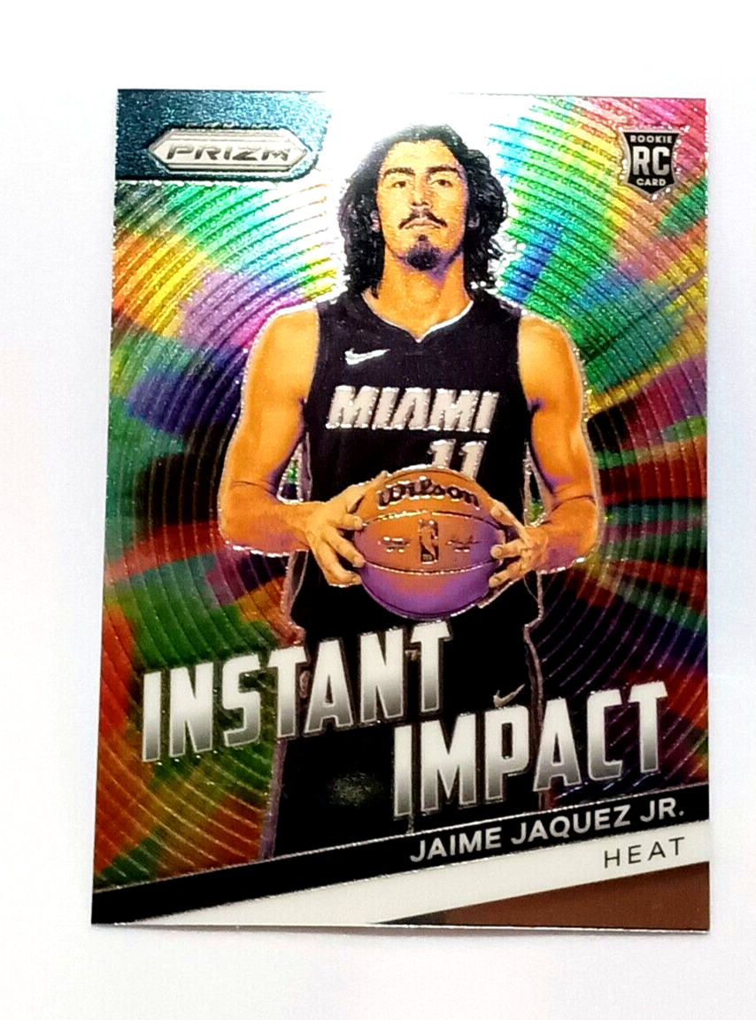 This 2023-24 Panini Prizm sports trading card features Jaime Jaquez Jr. of the Miami Heat, card number 23 in the Instant Impact insert set. It's a great addition for basketball fans and collectors, especially those who are looking for a rookie card. The card is manufactured by Panini and is part of the National Basketball Association (NBA) league. The card comes with features such as an insert and a parallel/variety of Impact. It's a must-have for those who want to complete their collection of sports trading cards. Get your hands on this 2023-24 Panini Prizm card and add it to your collection now!