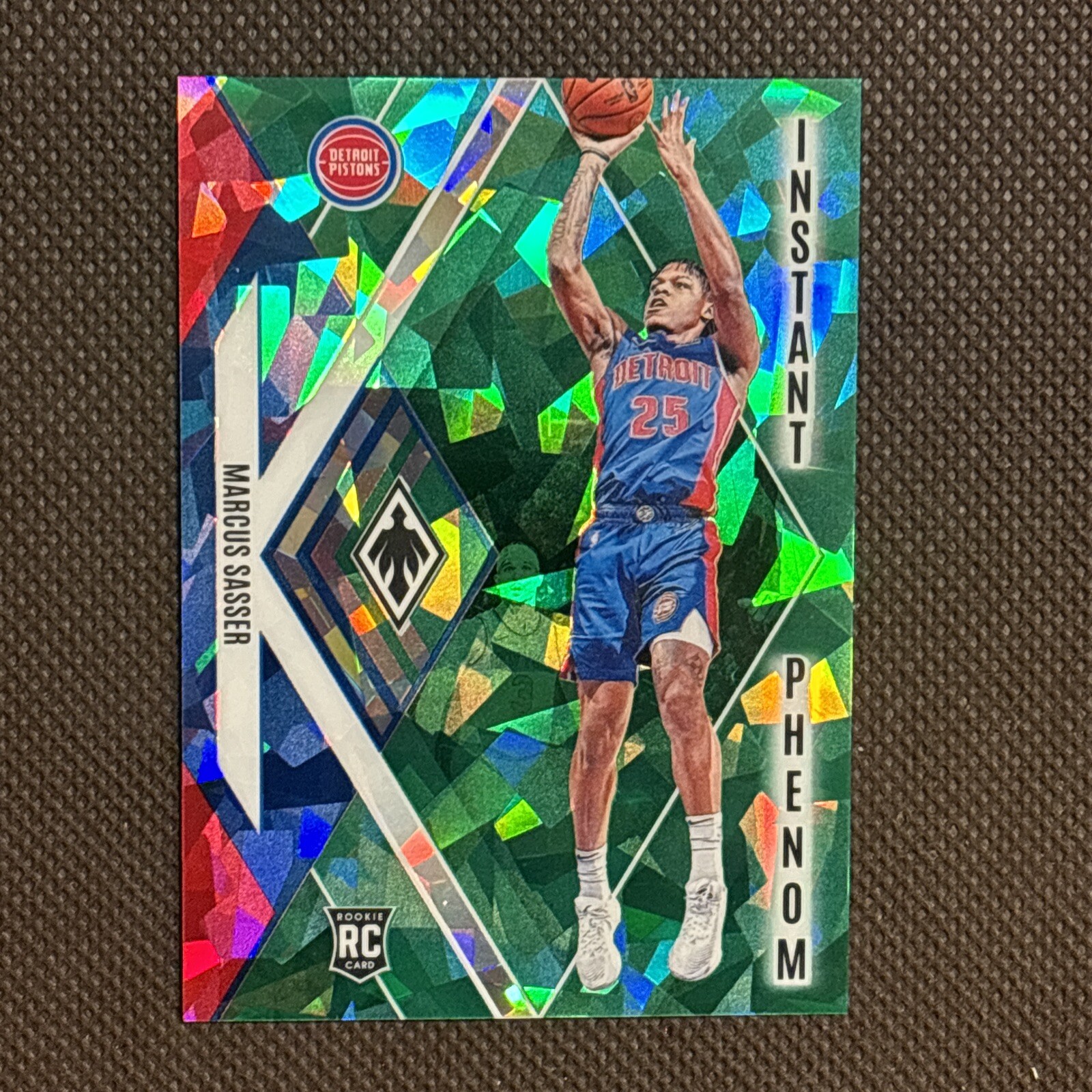 Elevate your collection with the 2023-24 Panini Phoenix Marcus Sasser Green Instant Phenom card. This exclusive collectible features the promising talent of Marcus Sasser, encapsulated in the striking Green Ice parallel that sets it apart from the standard release. With a limited print run of just 149, this serial-numbered rookie card is a must-have for enthusiasts and fans of the Detroit Pistons. Crafted by Panini, a trusted name in sports memorabilia, this card is part of the coveted Instant Phenom insert set and carries the card number 18. Whether you're a seasoned collector or a supporter of the Pistons, this card is a noteworthy acquisition, bringing a touch of the NBA's future vibrancy into your personal collection.