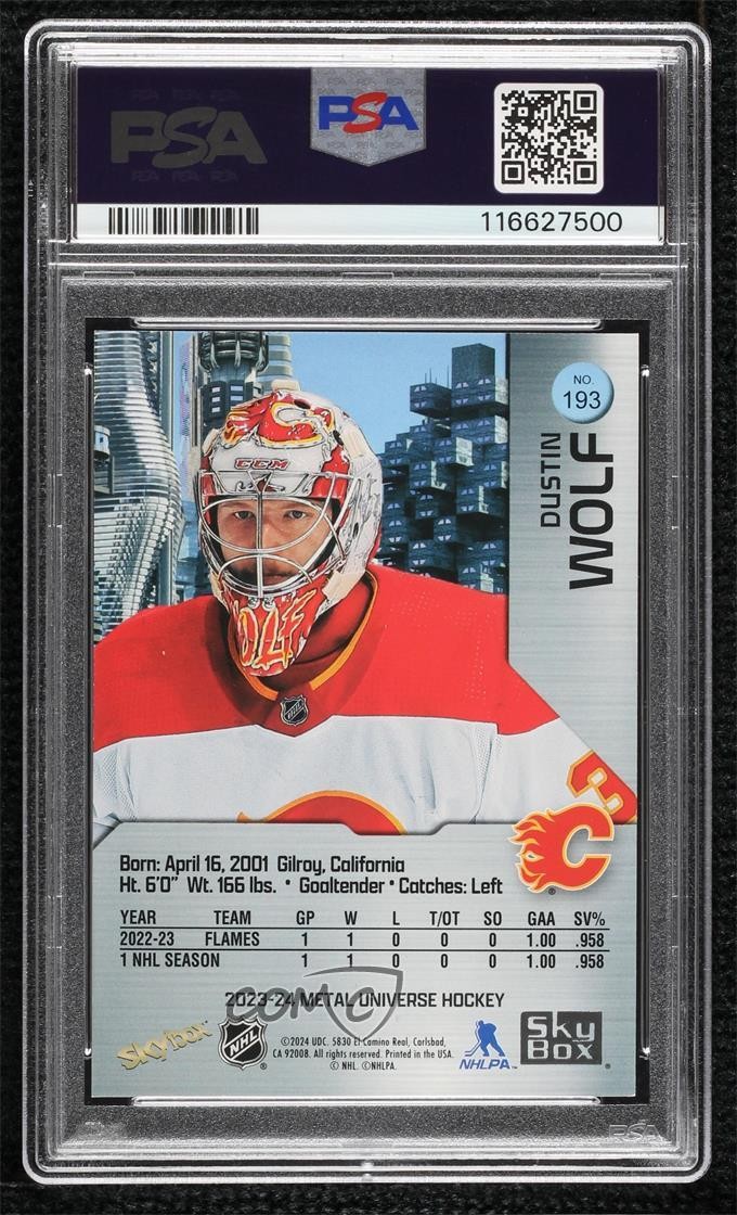 Card Number:193Parallel/Variety:Precious Metal Gems RedAdditional Description:Rookies - Dustin WolfLeague:National Hockey League (NHL)Set:2023-24 Skybox Metal UniverseSubset:RookiesPlayer/Athlete:Dustin WolfSport:Ice HockeySeries:Skybox Metal UniverseFeatures:Rookie, Serial Numbered, Base Set, Parallel/Varietybrand:Upper DeckTeam:Calgary FlamesManufacturer:Upper DeckPrint Run:100Season:2023-24