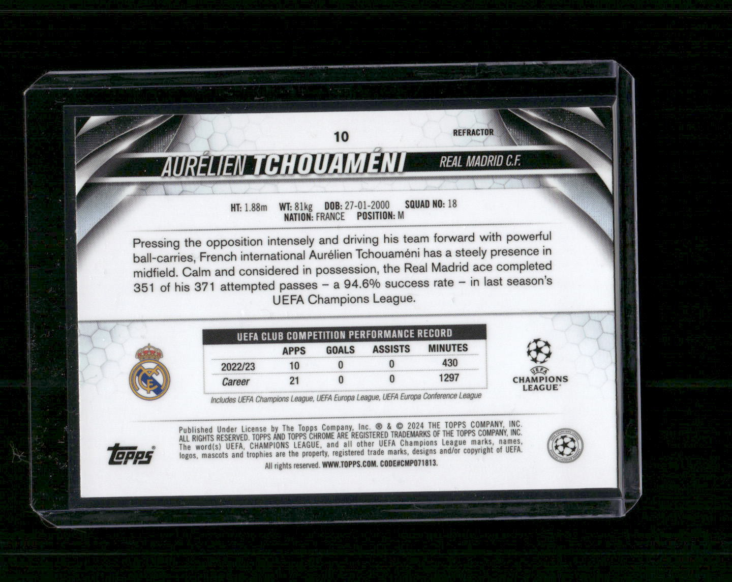 This is a nice example of a 2023-24 Topps Chrome UEFA Club Competitions #10 Aurélien Tchouaméni Refractor Other important information about this card: In 2023 Aurélien Tchouaméni played for the Real Madrid CF. Please check out our other listings for more great cards.