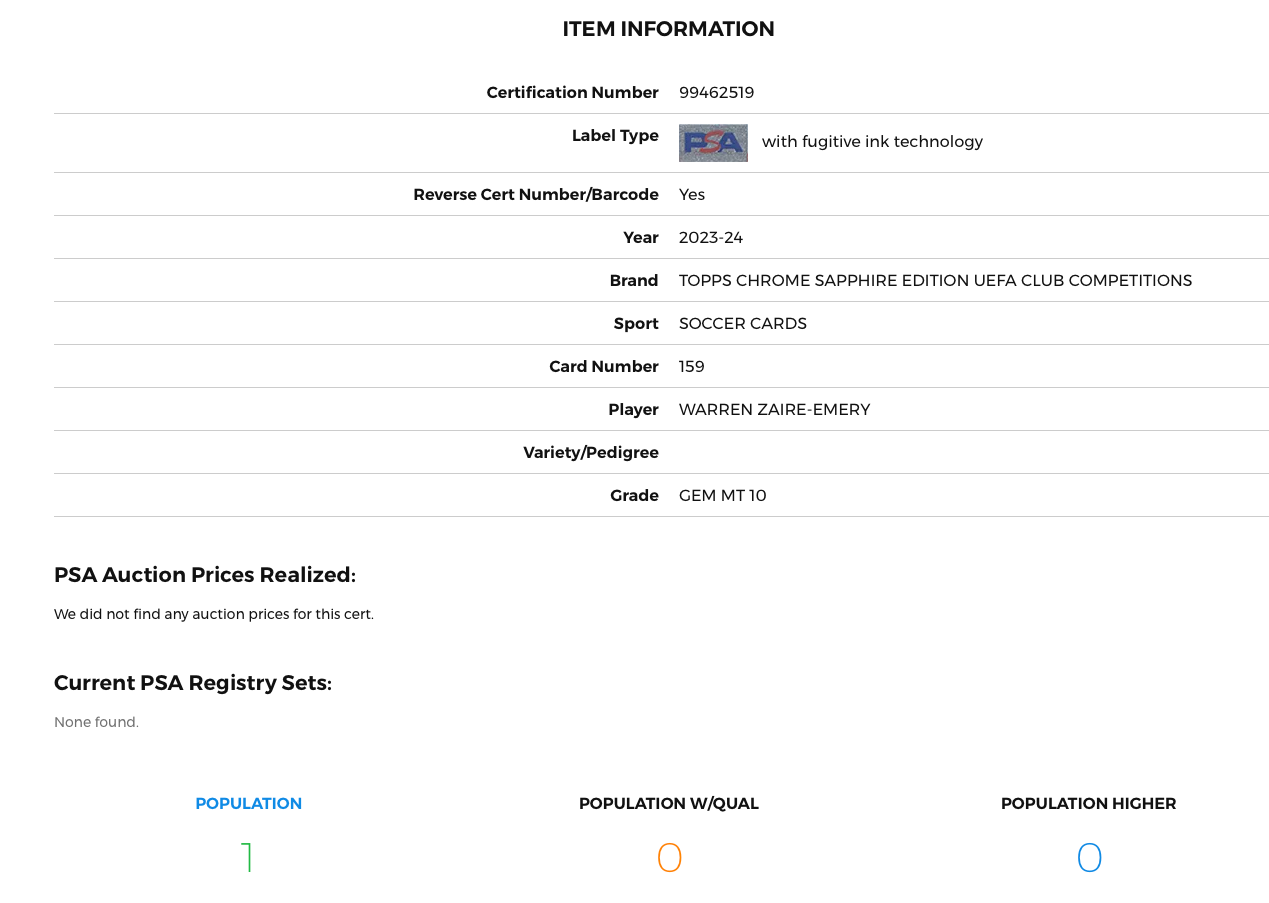 This card is a must-have for any collector! The vibrant sapphire finish makes Warren Zaire-Emery’s Future Stars rookie pop, and the quality is flawless. Shipping was incredibly fast, and the card arrived perfectly protected. The seller provides clear, detailed photos so you know exactly what you're buying. Great price for such a stunning card—highly recommend!