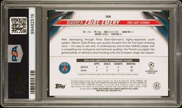 HIGH QUALITY FAST SHIPPING LOW PRICES Warren Zaire-Emery 2023-24 Topps Chrome UEFA CC Sapphire Future Stars Rookie Cup Welcome to Cousin Sal's Cards – Your Ultimate Sports Card Destination! Super-Fast & Secure Shipping We take pride in lightning-fast shipping and secure packaging to ensure your cards arrive safely. Inspect Every Detail High-definition photos showcase the true condition of each card, so you know exactly what you're getting. Cards Arrive Protected Every card is securely encased in a penny sleeve and top loader to maintain its pristine condition. Shipping Options to Suit You: · eBay Standard Envelope (For cards $20 and under) · USPS Ground Advantage (Reliable & cost-effective) · Priority Mail (Faster shipping option) · Priority Mail Express (For express delivery) · International Shipping (We ship worldwide!) Giving Back – Cards for a Cause We are proud to donate a portion of our revenue to St. Jude Children’s Research Hospital , supporting their mission to help children battling life-threatening illnesses. Every purchase helps make a difference! Return Policy All sales are final to ensure clarity and fairness for all buyers. Special Offer Inside! As a token of our appreciation, a special discount coupon awaits inside your package. Enjoy your exclusive savings! Make Your Best Offer We welcome offers on eligible listings—don’t hesitate to send your best deal! Thank you for visiting Cousin Sal's Cards —we appreciate your support! Happy collecting! Shipping Returns Join Us! At Cousin Sal's Cards, we understand that your time—and your collection—are valuable. As eBay Top-Ranked Sellers, we are committed to providing fast, reliable, and secure shipping. Orders placed before our cutoff time benefit from next business day shipping, ensuring your sports cards arrive promptly and safely. We proudly serve collectors from coast to coast and around the world, with international shipping costs calculated at checkout based on your destination. No matter where you are, we guarantee your treasures will reach you securely and swiftly. To further enhance your shopping experience, we offer complimentary shipping on orders totaling $100 or more (before taxes) within the continental United States, a luxurious perk designed to add value to your purchase. We’re dedicated to setting the standard for excellence in delivery, and we promise nothing less than prompt, efficient service with every order. At Cousin Sal's Cards, all sales are final, reflecting our commitment to product quality and customer satisfaction. Our dedicated customer service team stands ready to assist you with any inquiries or concerns. Indulge in the ultimate sports card experience at Cousin Sal's Cards, where luxury meets passion. Thank you for choosing us to elevate your collecting journey. Your satisfaction is our privilege, and we look forward to exceeding your expectations with every order. Become part of our exclusive community! Follow us on our social media channels and send us a message to receive an additional card for FREE. Each mystery card is chosen at random and could range from $1 cards to $50 cards, adding excitement to your collection. We hope you will love your purchase, however if you need to return it, we have a 60 day return policy. We hope you will love your purchase, however if you need to return it, we have a 60 day return policy. We hope you will love your purchase, however if you need to return it, we have a 60 day return policy. We hope you will love your purchase, however if you need to return it, we have a 60 day return policy. We hope you will love your purchase, however if you need to return it, we have a 60 day return policy. Suggested for You NBA Sports Cards (5) – LeBron James, Stephen Curry, Luka Doncic, Jokic, & Tatum $59.99 Trae Young 2021-22 Panini Donruss Optic Basketball SPLASH! Prizm Atlanta Hawks $14.99 Bam Adebayo 2021-22 Panini Player of the Day KABOOM #d 35/99 RARE SSP Miami Heat $49.99 Hobby Dads 5-Card Sports Pack – Mint Condition, Great Gift for Young Collectors! $59.99 Tom Aspinall 2024 Topps Chrome UFC Aqua Refractor #'d 174/199 $49.99 Austin Reaves 2023 Panini Donruss Basketball Green Holo Laser Spokes HOLO Lakers $9.99 Bukayo Saka 2023-24 Topps Merlin UCC Aqua Prism Refractor #11 Arsenal FC $29.99 Nikola Vucevic 2021-22 Panini Player of the Day KABOOM #d 98/99 SP Chicago Bulls $39.99 Jordan Love 2023 Panini Prestige Football Xtra Points Sunburst Green Bay Packers $19.99 Khris Middleton 2021-22 Panini Player of the Day KABOOM #'d 16/99 Rare SSP Bucks $39.99 Kevin Garnett 1999-00 Topps All-Matrix Instinctive Force Refractor Timberwolves $49.99 Lamar Jackson 2021 Panini Donruss Optic Football MY HOUSE! Prizm Ravens HOLO $29.99 Add suggested items to your listings - Check it out on 3Dsellers.com eBay listing template by 3D sellers.com - Try for Free!