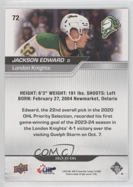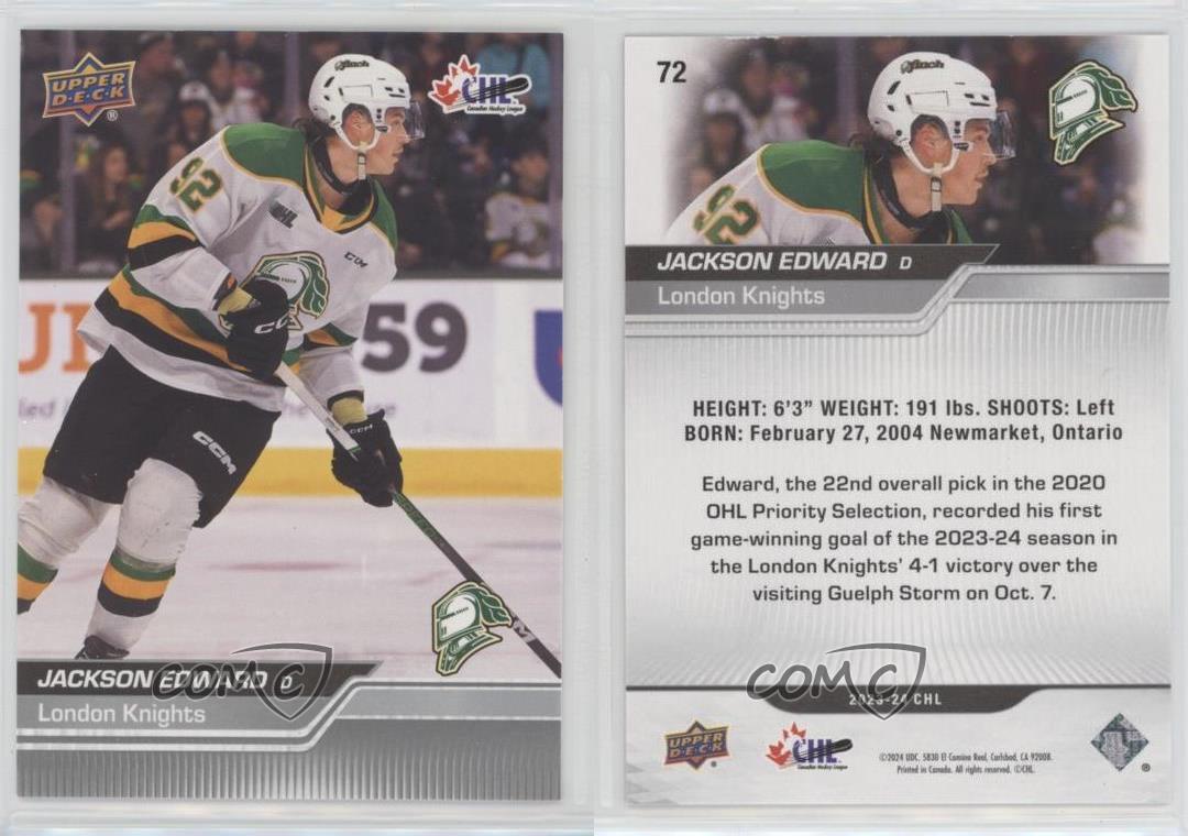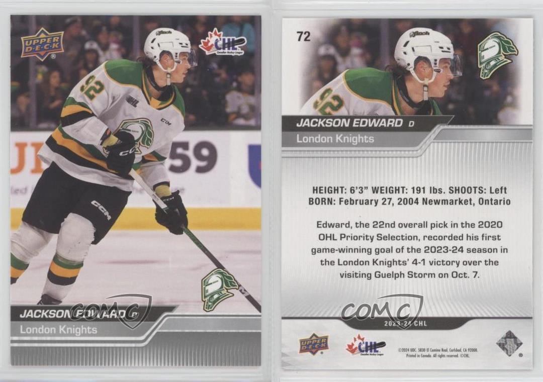 2023-24 Upper Deck CHL - [Base] #72 Jackson Edward - Rookie - Ice Hockey Card - Featuring the London Knights - Featuring Jackson Edward Search for more: 2023-24 Upper Deck CHL Search for more: 2023-24 Upper Deck CHL - [Base] View all of our Listings Auctions Buy It Now About Us Located in the beautiful Pacific Northwest, COMC (Check Out My Cards) is the world's largest consignment service for trading card singles. More than 10,000 people have used our consignment service to list over 50 million trading cards. Find out how we can help you consign your items on eBay by contacting us through eBay messaging. COMC -- "The Safe & Easy Way to Buy & Sell" Representative Image - Select Specific Item above to see image of actual item Representative Image - Select Specific Item above to see image of actual item Raw Condition for Modern Cards Unless otherwise noted, raw modern cards are listed in Near Mint-Mint condition or better. A NM-MT card appears to be Mint at first glance, but upon closer inspection, may exhibit some of the following: minor print defects (e.g. roller marks, print line, dimple), minor scratches, slight edge wear, and slight corner wear. Centering is clearly visible in the images provided and does not factor into our condition assessment. Raw Condition for Vintage Cards Unless otherwise noted, raw vintage cards are listed in Excellent condition or better. An EX card may exhibit some of the following: minor rounding of corners, surface wear, print defects, light scratches, and slight edge wear/chipping. Centering is clearly visible in the images provided and does not factor into our condition assessment. Domestic Shipping Combined shipping for multiple items is available. To receive combined shipping, please ensure all desired items are in your eBay shopping cart before proceeding to checkout. eBay limits orders to 40 items per order. We automatically combine multiple orders placed on the same day. If you place multiple orders on the same day, please contact us to request a refund of applicable shipping costs. Signature confirmation may be required on invoices over $400. All cards are protected and shipped securely. International Shipping COMC offers eBay's International Shipping (EIS) for international orders under $2,500* (see country exceptions below). All duties and import fees are paid at checkout; in the rare event that there are additional import fees upon delivery, these are borne by the buyer. EIS packages route through a shipping hub in Erlanger, KY before shipping to their final destination. Please note that EIS does not allow for combined shipments. The shipping rates are determined by eBay and cannot be adjusted. *Maximum sale price exceptions: Colombia, Kuwait ($2,000); Taiwan ($1,539); Chile, Costa Rica, Guatemala, Honduras, Trinidad and Tobago ($1,000); Antigua and Barbuda, Aruba, Belize, Dominica, Grenada, Philippines, Saint Kitts and Nevis, Saint Lucia, Montserrat, Turks and Caicos Islands ($500); Dominican Republic, El Salvador ($200). Please request a shipping quote through eBay messaging for orders that exceed the maximum sale price supported by eBay's International Shipping. You will be responsible for all duties and import fees for international orders shipped outside the EIS. All cards are protected and shipped securely. Payment COMC does not accept offers on our cards through our eBay storefront. COMC utilizes eBay’s managed payments system. If you are experiencing difficulties making a payment, please contact eBay for assistance. Return Policy Returns are only accepted on the rare occasion the item is not as described. If you are making a return, please initiate the return process through eBay so a mailing label can be provided for you. Prior to listing, our expert team carefully assessed this item to represent it accurately. Please review the description and high-definition images prior to purchasing to ensure this item meets your satisfaction. We welcome you to contact us if you have further questions about this item. Trust and Integrity COMC carefully assesses each item consigned to us to prevent fraudulent items from entering the marketplace. If you believe an item offered on COMC may be fraudulent, please contact us with details so we can investigate the issue. Items we determine are outside our supported items policy may be removed. Last Modified: 7/8/2025 4:26:46 AM PDT