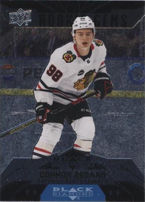 The 2023-24 Upper Deck Extended Series Connor Bedard Black Diamond Rookie Gems trading card features the up-and-coming ice hockey player Connor Bedard from the Chicago Blackhawks. This 4 Diamond parallel variety card is part of the Extended Series insert set, showcasing Bedard as a rookie in the National Hockey League (NHL). Manufactured by Upper Deck in Italy, the card is made of 35 Pt. paperboard and aluminum materials, ensuring a near mint or better condition for collectors to enjoy.
