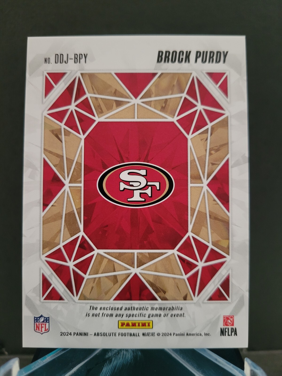 The 2024 Absolute Brock Purdy Draft Diamonds Jersey Card Swatch DDJ-BPY features an autographed trading card of Brock Purdy, a player for the San Francisco 49ers in the National Football League (NFL). Manufactured by Panini as part of the 2023 Panini Absolute set, this card is an insert parallel variety known as Diamond. The card showcases a jersey swatch from Purdy, making it a unique and collectible item for fans of football trading cards.