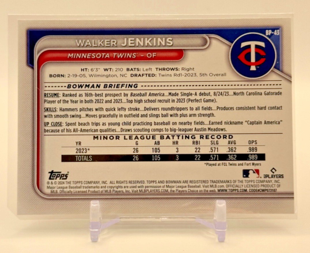 Elevate your baseball collection with the 2024 Bowman Baseball Paper Lot featuring first prospect cards of Walker Jenkins, card number BP-43. This set includes eight standard-sized cards, each showcasing the promising talent of Jenkins in his Minnesota Twins gear. A must-have for fans and collectors, these cards are from the esteemed Topps manufacturer, ensuring quality and authenticity. Each card in this lot is an original print from the 2024 Bowman Baseball series, capturing the excitement of the Major League Baseball season. The base set cards, made of premium paper material, are presented in English and are not autographed, preserving the classic essence of the sports trading card tradition.