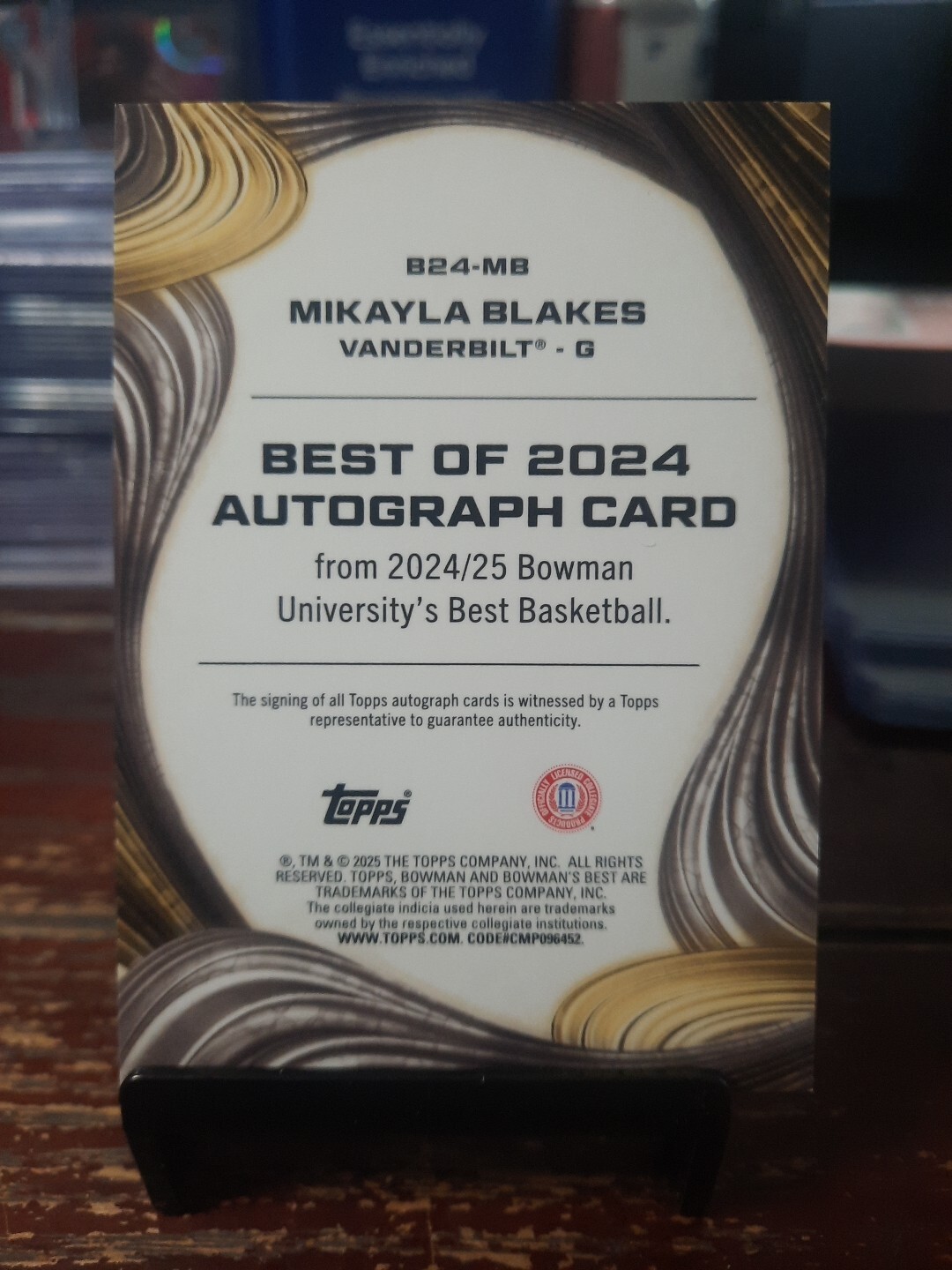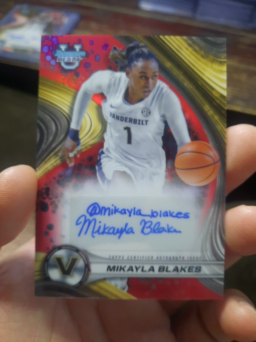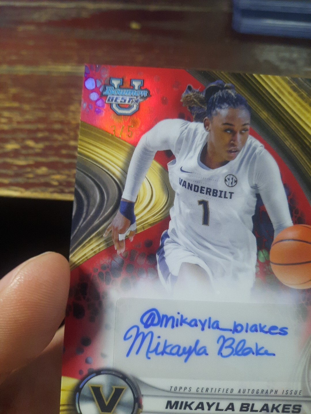 This Mikayla Blakes auto is a dream for collectors! The red refractor pops, the on-card signature is crisp, and being #3/5 makes it ultra-rare. The Vanderbilt inscription adds a cool collegiate touch. Bowman's quality shines through with sharp details and vibrant colors. A true gem for basketball card enthusiasts - this will be the crown jewel of any collection. The rarity and player potential make it a fantastic long-term hold. Already looks stunning in my display case!