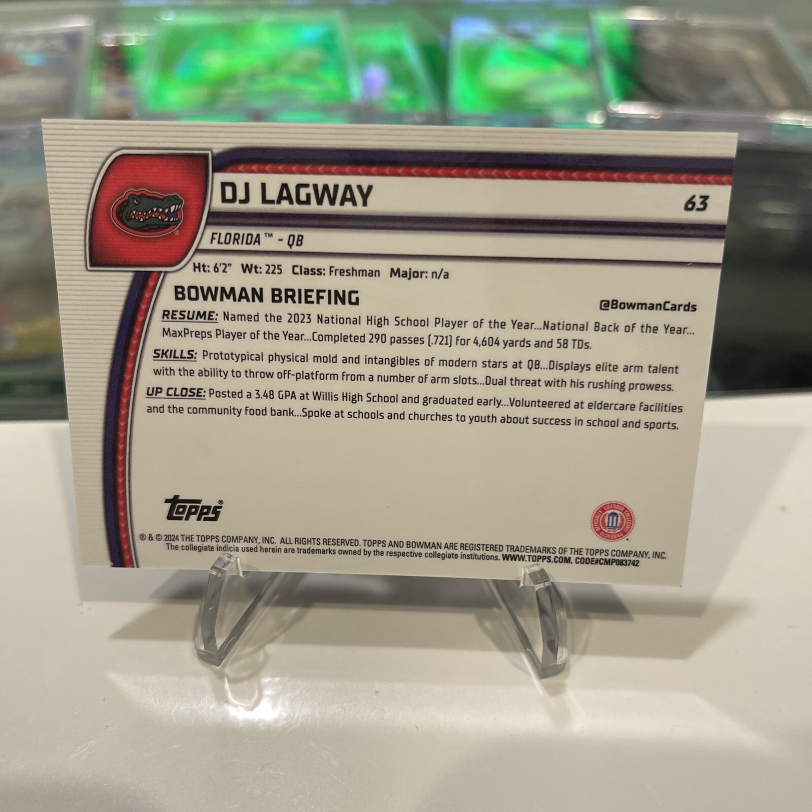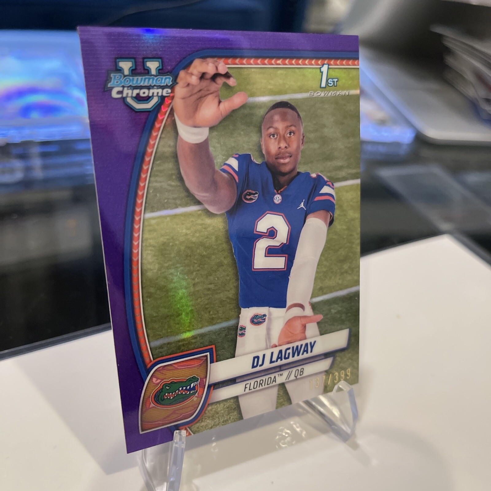Capture a piece of collegiate football memorabilia with the 2024 Bowman University Chrome DJ Lagway True Purple Refractor card. As a notable collectible, this card features the Florida Gators' promising talent, DJ Lagway, and is a must-have for fans and collectors alike. Its unique True Purple Refractor finish adds a vibrant touch to its design, making it stand out in any collection. Limited to just 399 prints, this serial-numbered rookie card is from the esteemed Bowman manufacturer, ensuring its authenticity and quality. Part of the illustrious 2024 Bowman University Chrome set, card number 63 is a cherished piece that celebrates the spirit and energy of NCAA athletics.