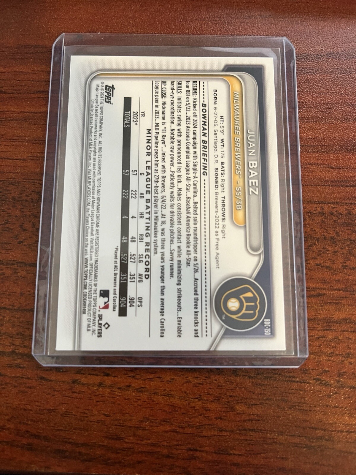 Insert Set: Prospects Card Number: BCP-160 Team: Milwaukee Brewers Season: 2024 Print Run: 250 brand: Topps Set: 2024 Bowman Chrome Features: Rookie, Insert, Serial Numbered, Parallel/Variety Manufacturer: Topps Series: Bowman Chrome Player/Athlete: Juan Baez Sport: Baseball League: Major League Baseball (MLB) Parallel/Variety: Purple Refractor