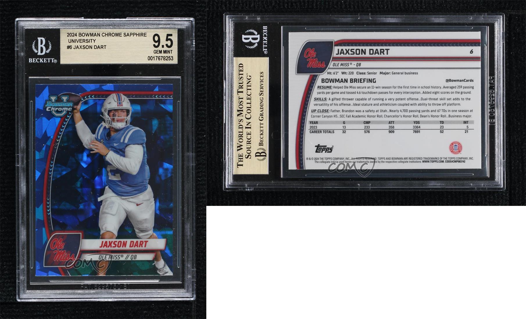 Set:2024 Bowman University Chrome Sapphire EditionLeague:National Collegiate Athletic Association (NCAA)Team:Ole Miss RebelsParallel/Variety:[Base]Player/Athlete:Jaxson DartSeason:2024Sport:FootballFeatures:Rookie, Base SetManufacturer:ToppsSeries:Bowman University Chrome Sapphire EditionCard Number:6brand:Topps