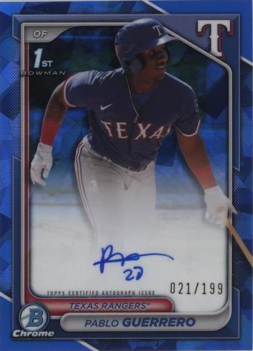 Up for sale is a 2024 Bowman Chrome Sapphire card featuring Pablo Guerrero, a rookie player for the Texas Rangers. The card is an Original/Licensed Reprint and is part of the Chrome Sapphire Prospect Autographs insert set. It is a Sports Trading Card with a Parallel/Variety of CHROME PROSPECT AUTOGRAPH and is serial numbered to /199. The card is authenticated by Topps and is in PSA 10 #PG Rookie condition. This is a great opportunity to add a rare card to your collection. Don't miss out on this chance to own a piece of baseball history!