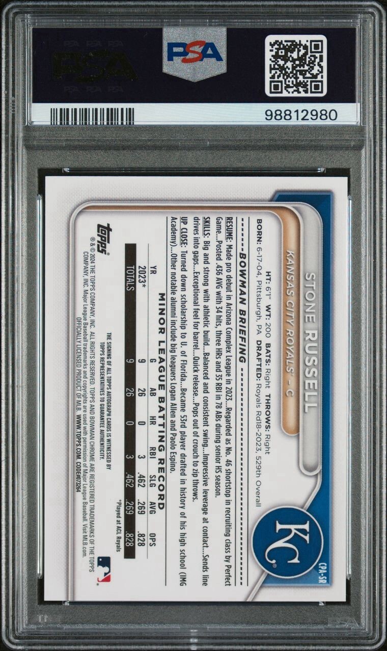 This 2024 Bowman Chrome Prospects Autograph card features Stone Russell, a promising rookie from the Kansas City Royals. It is 241/250 and a purple refractor. The card is well-preserved and is in excellent shape, maintaining its original quality since its manufacture. It is a great addition to any sports trading card collection, especially for fans of Major League Baseball (MLB). The card is ungraded but has been authenticated, ensuring its authenticity. It is a 2024 edition from the Bowman manufacturer and has a chrome parallel/variety. The card number is CPA-SR and it belongs to the 2024 season. This sports trading card is a must-have for collectors and fans alike, and is a valuable piece for any collection. Card will be shipped USPS 2-3 days with tracking in padded envelope.