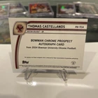 Elevate your collection with the 2024 Bowman Chrome University Thomas Castellanos rookie card. Featuring the standout Boston College Eagles football player, this card is a must-have for fans and collectors alike. With its reflective Chrome finish, the card captures the essence of Castellanos' dynamic presence on the field. The card, numbered PA-TCA, is part of the esteemed 2024 Bowman Chrome University set and comes as an autographed original. Celebrate the beginning of what promises to be an illustrious athletic career with this unique piece of sports memorabilia. Whether for display or as a treasured keepsake, this card is a tangible connection to the sport and a tribute to the talent of Thomas Castellanos.