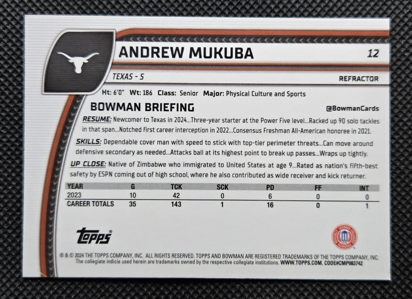 Capture a piece of college football history with the 2024 Bowman Chrome University Andrew Mukuba Refractor #12 card. This trading card features the talented player in his Texas Longhorns gear, a must-have for fans and collectors alike. The premium refractor finish adds a dazzling touch to the card, making it stand out in any collection. The card is part of the esteemed 2024 Bowman series, known for its quality and collectibility. It's not autographed, preserving the sleek design of the card. Whether you're a fan of Andrew Mukuba, a Clemson Tigers supporter, or a connoisseur of NCAA memorabilia, this card is an essential addition to your sports trading card repertoire.