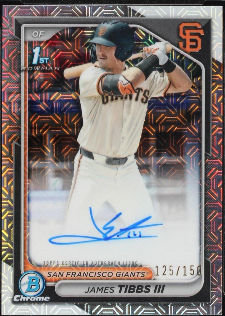 The 2024 Bowman Draft - Chrome Prospect Autographs James Tibbs III #CPA-JT Choice sports trading card is a highly sought-after collectible item for baseball fans. Produced by Topps, this limited edition card features the autograph of Major League Baseball player James Tibbs III from the San Francisco Giants. With a print run of only 150, this serial numbered card is a valuable addition to any sports card collection, especially for fans of the rookie player. The Choice Refractor parallel adds a unique touch to this insert card from the Chrome Prospect Autographs set, making it a must-have for baseball enthusiasts.