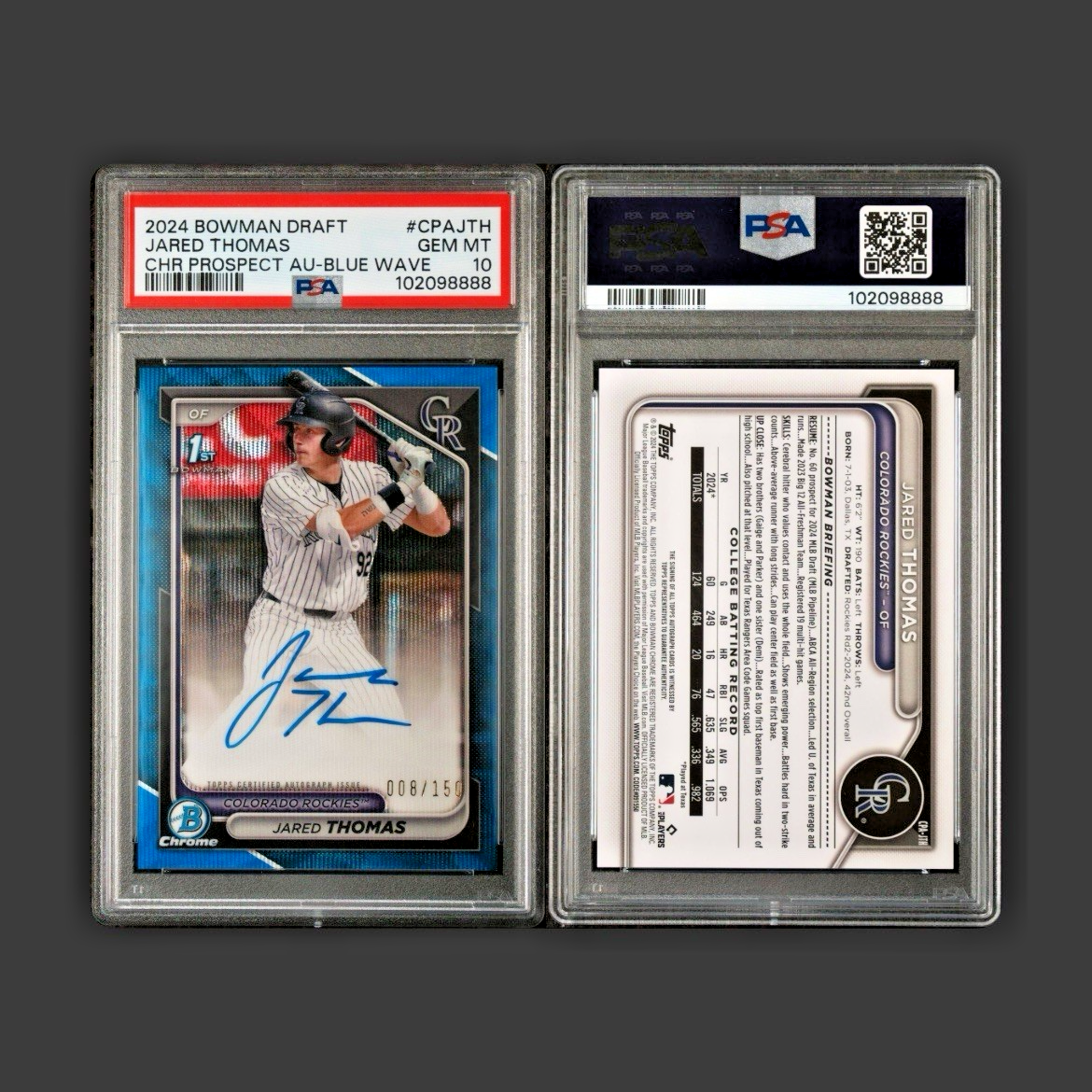 The 2024 Bowman Draft Jared Thomas 1st Blue Wave Auto /150 PSA 10 trading card is a highly collectible baseball card featuring the autograph of Jared Thomas from the Colorado Rockies. This card is part of the Chrome Prospect Autographs insert set by Topps, with a limited print run of 150. Graded as a PSA 10 Gem Mint, this card is a rare find as it has a population of only 12 in existence. It is a valuable addition to any sports trading card collection, especially for fans of Major League Baseball and rookie card enthusiasts.