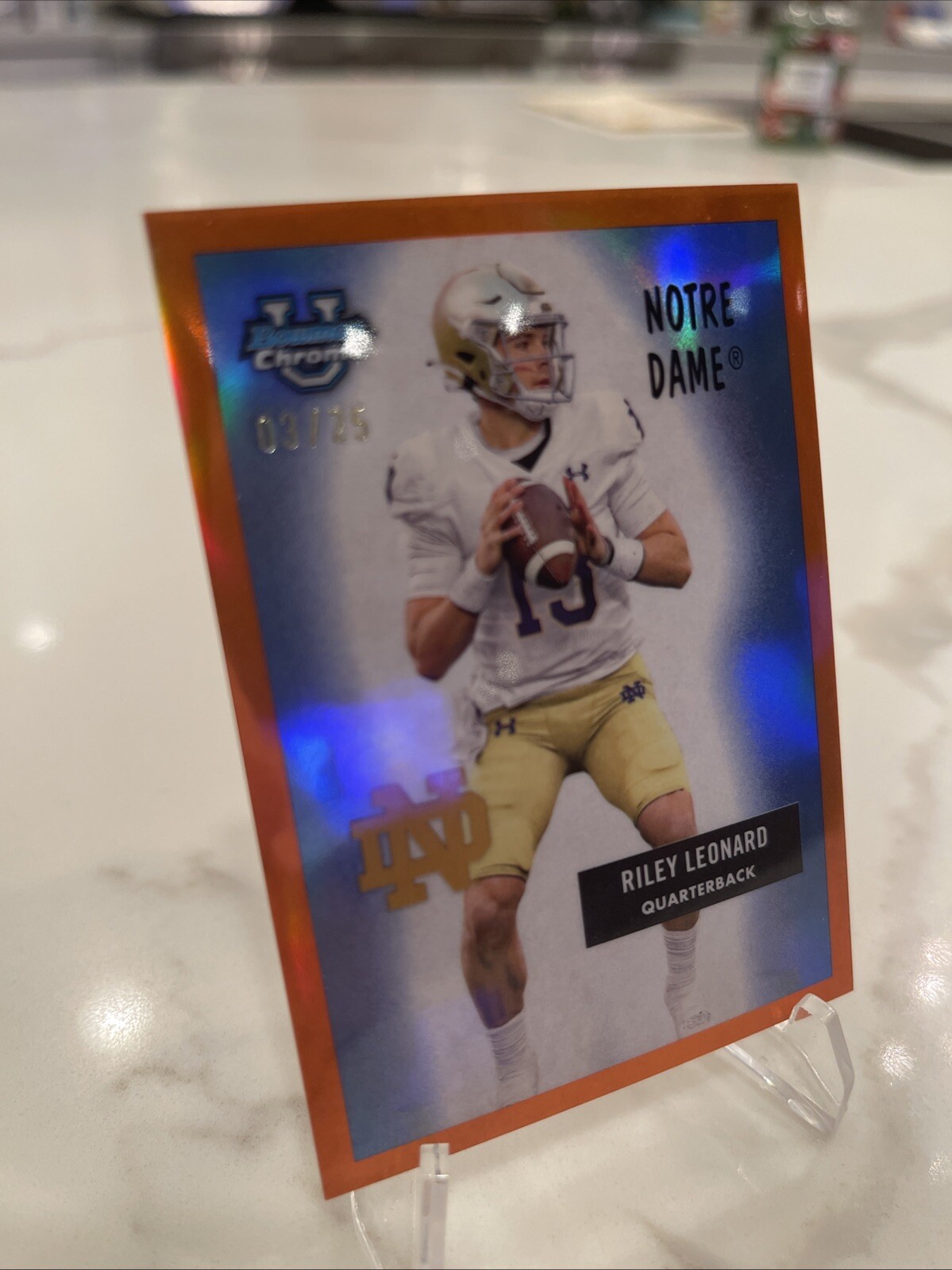 Get your hands on this rare and highly sought-after sports trading card featuring Riley Leonard, a standout athlete from the University of Notre Dame and Duke Blue Devils. This 2024 Bowman Chrome Path To Glory Orange Refractor Rookie Card is a true gem, with a limited edition serial number of only 7/25, making it a valuable addition to any sports memorabilia collection. The card is in its original form, with no signs of wear or damage, and comes from a reputable manufacturer, Bowman. It features Joe Burrow, a renowned football player, and is part of the Contenders series. The card is in English and has a standard card size with a thickness of 35 Pt. Don't miss out on this opportunity to own a piece of sports history.