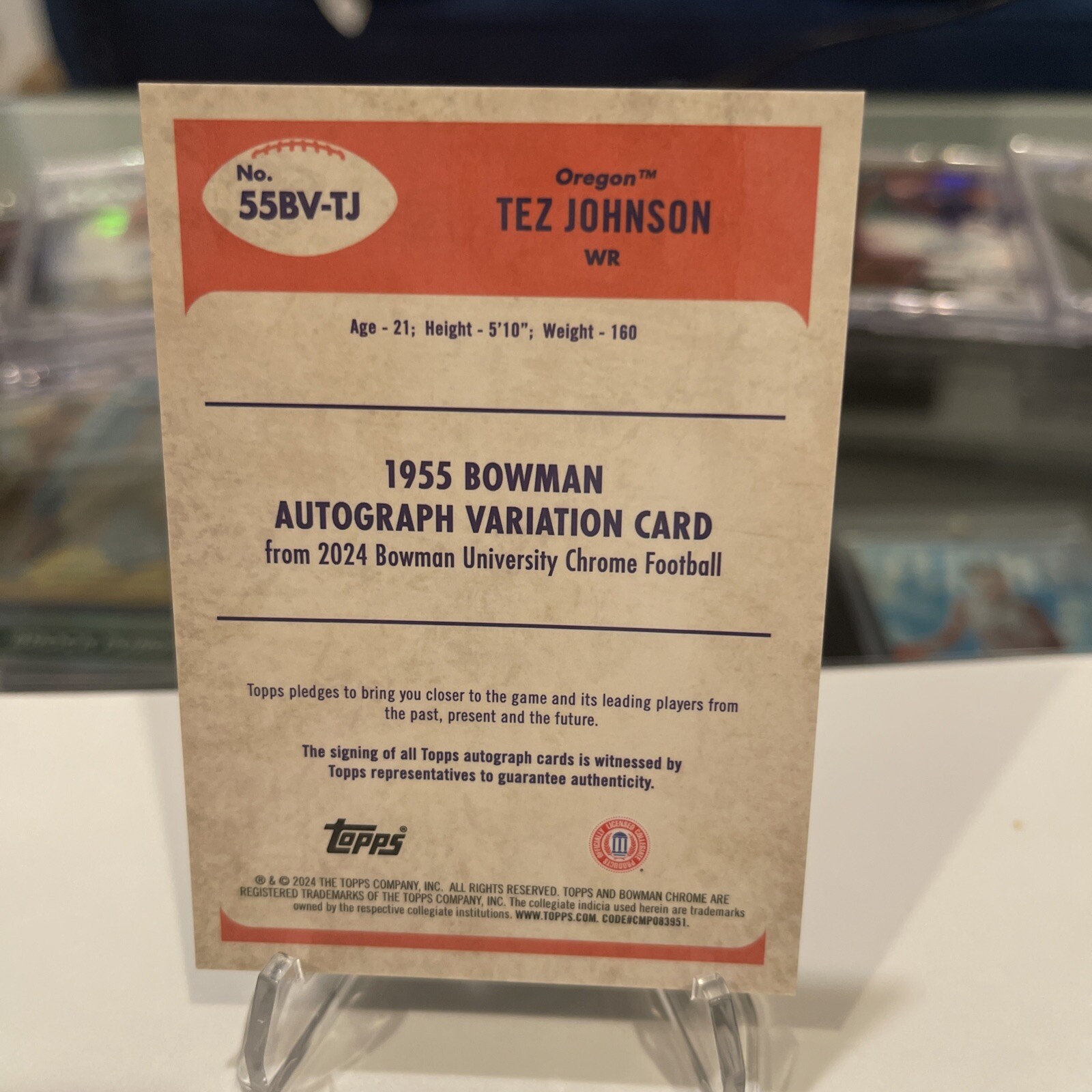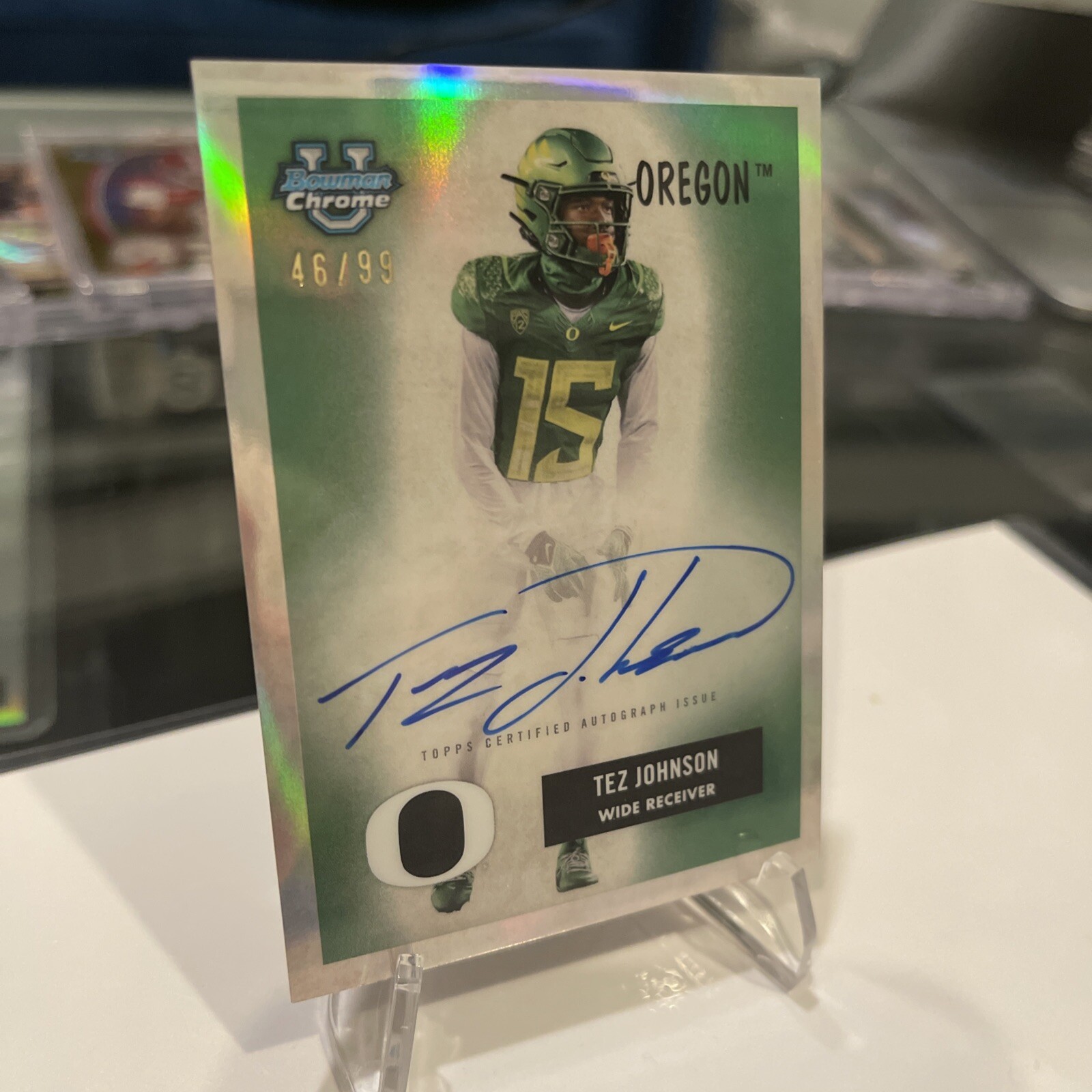 Capture a piece of sports history with the 2024 Bowman U Chrome Tez Johnson Color Match Auto card. Limited to just 99 prints, this rare find features the Oregon Ducks' standout in a dazzling Green 1955 Bowman Auto parallel variety, making it a must-have for collectors and football enthusiasts alike. Each card is serial numbered and includes an authentic autograph by Tez Johnson himself, certified by Topps. Beyond the striking design and exclusive print run, this card is a testament to Johnson's athletic prowess and potential. As a hard-signed gem from the 2024 Bowman set, it's a unique treasure that celebrates both the player's career and the NCAA's rich tradition of competition. Add this card to your collection and own a snapshot of football greatness.