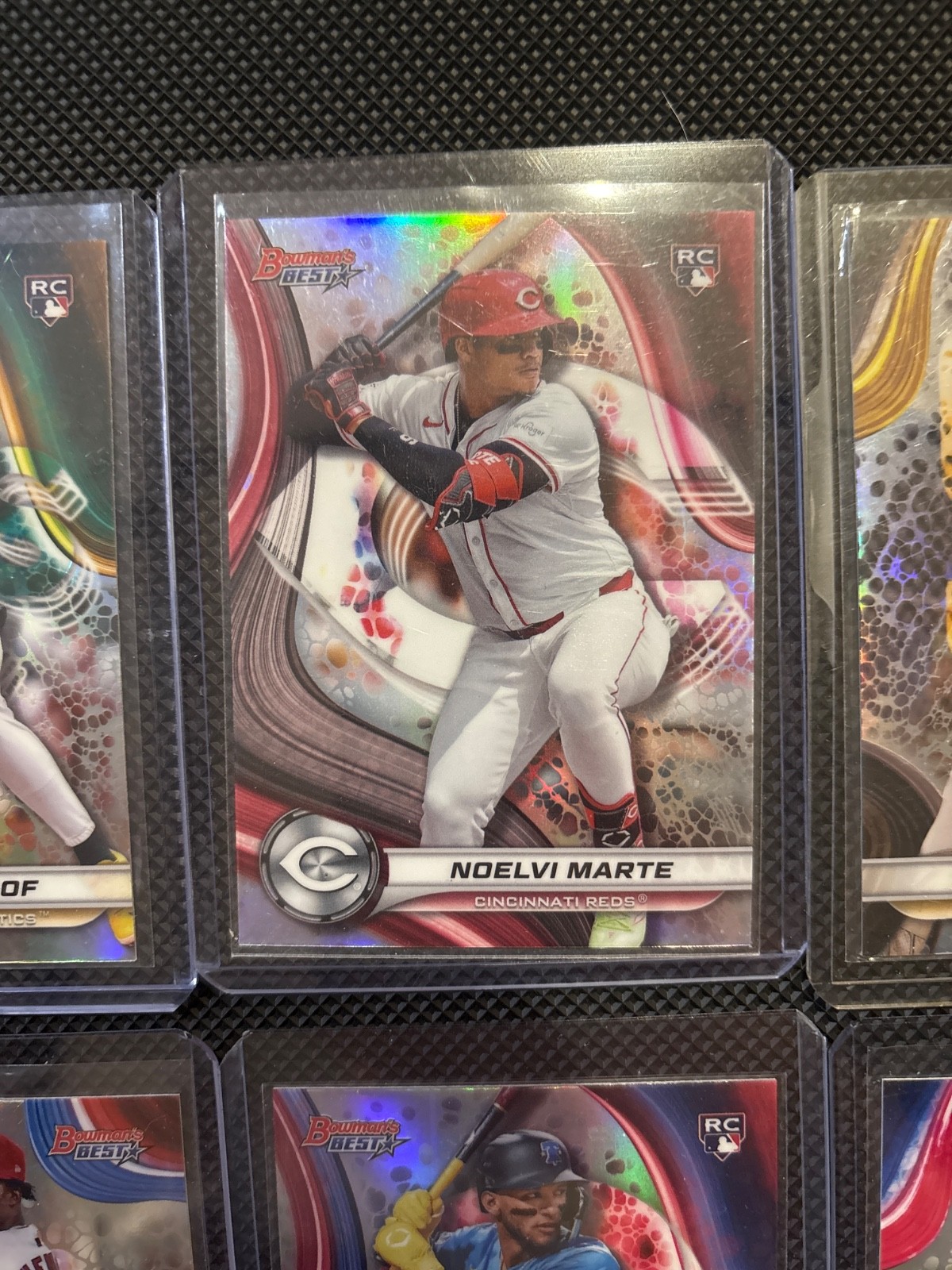 The product is a lot of 8 refractor trading cards from the 2024 Bowman's Best set featuring players from the Major League (MLB). The cards are standard size, made of card stock, and are original licensed prints by Bowman.