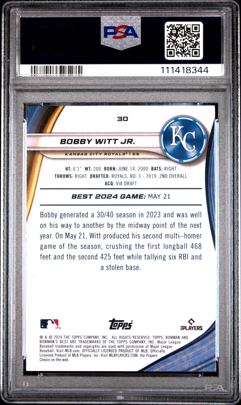 2024 Bowman's Best - Bobby Witt Jr. Mini-Diamond Refractor /299 #30 Any notable flaws or damage putting them outside the condition stated in this listing will be noted. Please use photos provided for your own assessment. Graded card cases may come chipped, scratched, and scuffed. I do not offer partial refunds or returns because of the case condition. All single cards will come in protective cases. If you purchase a listing that's sold as a lot it may come in snap cases or sealed in a team bag, and not all cards will be individually sleeved and top loaded in all lots. Raw cards are sold as such, and no questions regarding expected grade or guarantees of such will be responded to. Condition is noted as used - cards can have any number of issues that do not detract from the overall look of the image on the card. These issues can include scratches/surface wear, and flaws on edges and corners. See photos provided for centering condition as well as to make your own assessment of card condition. Cards with Standard eBay Envelope delivery will be delivered in a 4x8 bubble mailer with card toploaded and sealed in a team bag. All orders will be processed and packaged within 1-2 business days. Orders with Standard eBay Envelope delivery, please expect a further estimated delivery time. More pictures can be provided upon buyer's request.