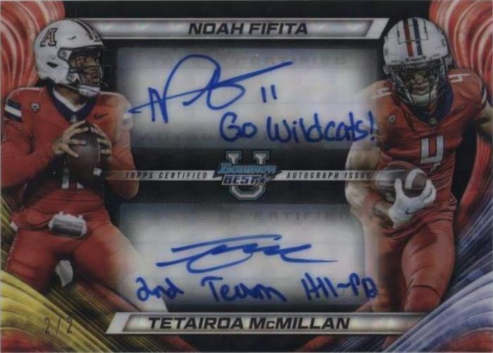 The Tetairoa McMillan Noah Fifita Dual Auto with Inscription 1/2 from 2024 Bowman U Best Arizona trading card features autographs from the two players, Tetairoa McMillan and Noah Fifita, who are associated with the Arizona Wildcats football team. This limited edition card is a part of the 2024 Bowman’s U Best set by Topps and is a Black Geometric Refractor Parallel/Variety with a print run of only 2. It is the First on Print. It includes special features like being serial numbered, having a rookie designation, and is an insert card, making it a valuable addition for collectors of sports trading cards.
