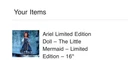 Ariel Limited Edition Doll, The Little Mermaid - Disney Collection 2024 Condition- Brand new in factory sealed packaging. Location- Orlando FL Local Pickup- Available USA Shipping 📦 Available with tracking provided. This limited edition Ariel Disney doll is a must-have for any Disney fan. The doll stands at 17 inches tall and is based on the character from the popular movie "The Little Mermaid". It is a contemporary collectable from the Disneyana franchise and is set to be released in 2024. The doll is perfect for display or play and is sure to bring a smile to anyone's face.