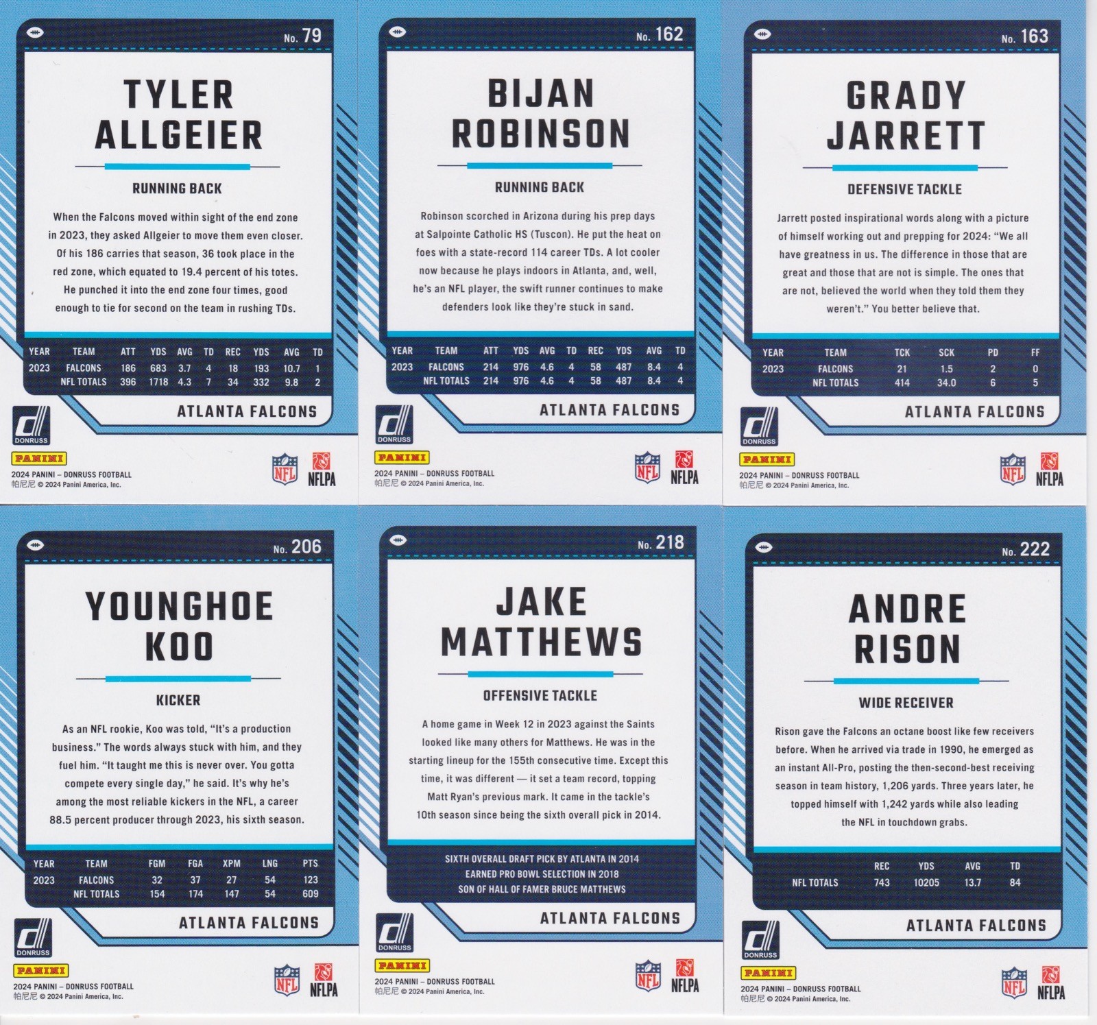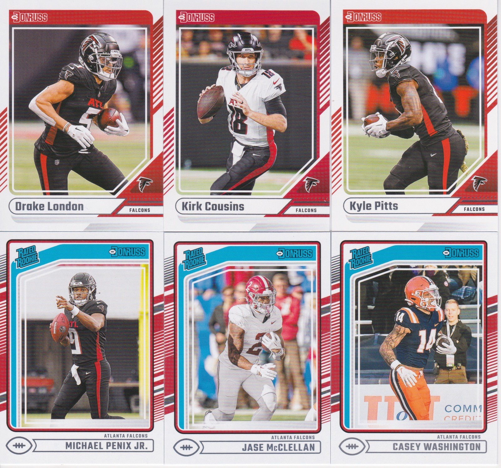 2024 Donruss Football Complete Team Set (12) Atlanta Falcons Michael Penix Jr RC Description: 2024 Donruss Football Complete Team set. Cards in at least nrmt-mint condition and are similar to the cards in the picture. Includes the following: #79 Tyler Allgeier #162 Bijan Robinson #163 Grady Jarrett #206 Younghoe Koo #218 Jake Matthews #222 Andre Rison #229 Drake London #280 Kirk Cousins #292 Kyle Pitts #308 Michael Penix Jr. RC #375 Jasce McClellan RC #392 Casey Washington RC Shipping: Calculated Shipping to U.S. - shipped in a plain white envelope. Shipping Discounts: Will discount shipping on multiple items won - $.25 additional for each card won. Please contact us on reduced shipping on sets and lots won. We only sell quality cards so please don't worry about bidding on a poor product. If there is something wrong with a card we will let you know. We stand behind the cards we sell and will refund your money if you are unhappy with any product. Please don't hesitate to contact us if you have any questions. Please see our other listings of Football Cards. _gsrx_vers_1715 (GS 9.9.2 (1715))