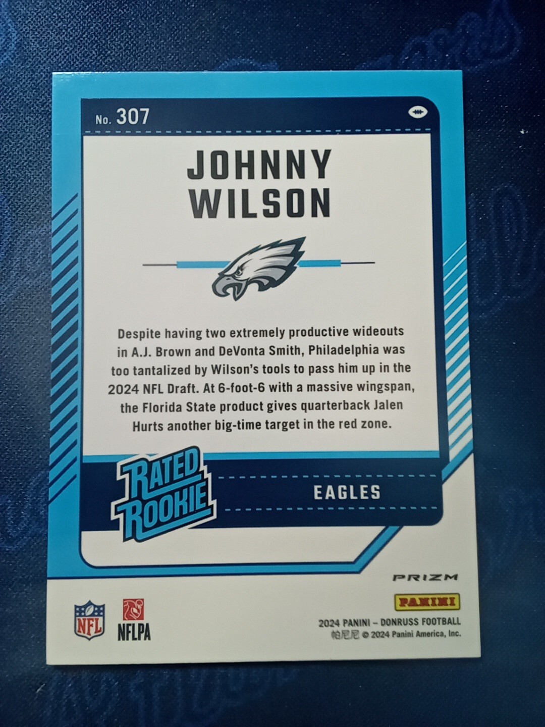 Capture the excitement of the gridiron with this 2024 Donruss Optic Johnny Wilson Rookie Card, card number 307. This collectible card features the promising talent of Johnny Wilson, a key player for the Philadelphia Eagles, presented in a striking Red Green Optic Preview design that's a standout in any collection. Officially licensed by the National Football League, this card is from the reputable Panini manufacturer, ensuring top-notch quality and authenticity. Whether you're a die-hard Eagles fan or a dedicated collector of rookie cards, this piece is a must-have for its representation of the sport and the athlete's potential.