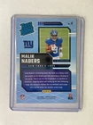 The product is a sports trading card featuring Malik Nabers, a football player from the New York Giants. The card is part of the 2024 Donruss set and has a retro design. It is a Rated Rookie Blue Foil Special Edition card and is autographed. The card is an insert and features the National Football League (NFL).