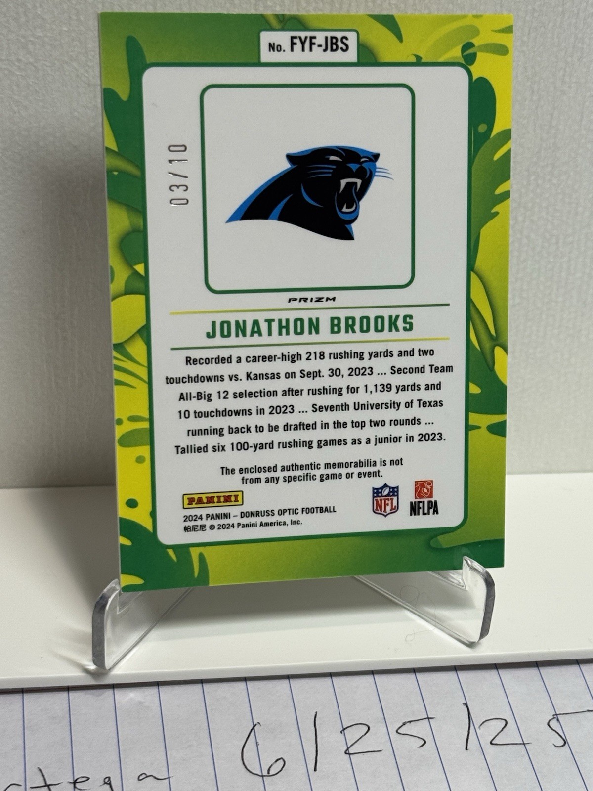 This card is an absolute gem for any collector! The stunning gold parallel and insane patch make it a standout piece, and being numbered 3/10 adds serious rarity. Jonathan Brooks’ rookie hype plus that bold Panthers swatch creates major eye appeal. A must-have for NFL memorabilia fans—condition is pristine and the design pops! 🔥