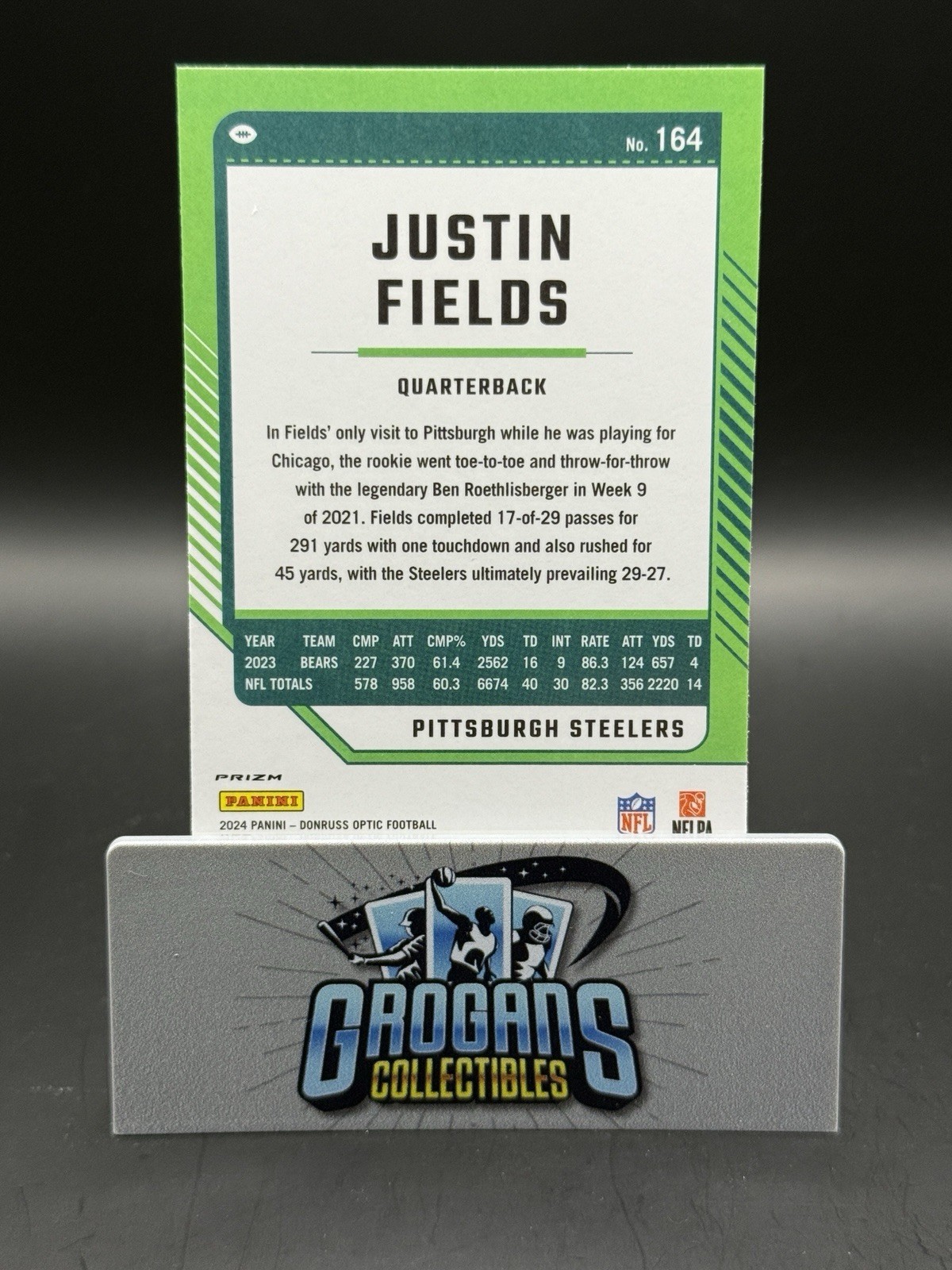 Ask about BULK order shipping and discounts! Any offers less than 70% of list price will be declined automatically and not countered. Will only consider offers at 80% of COMP VALUE if buying in bulk/return buyer. Card not shipped in one touch case. Card will be shipped in a penny sleeve plus top loader, sealed in a team bag, in a standard envelope with tracking. Reminder: Please note payment is required within 7 days, otherwise automatic cancellation will occur. The product is a 2024 Donruss Optic Justin Fields Silver Holo Prizm trading card featuring the player from the Pittsburgh Steelers. This card is part of the National Football League (NFL) and is a non-autographed sports trading card. With its sleek design and rare Holo Prizm parallel variety, this card is a highly sought-after collectible for football fans and card enthusiasts alike. It is a valuable addition to any sports memorabilia collection, showcasing the talent and potential of Justin Fields in the 2024 season.