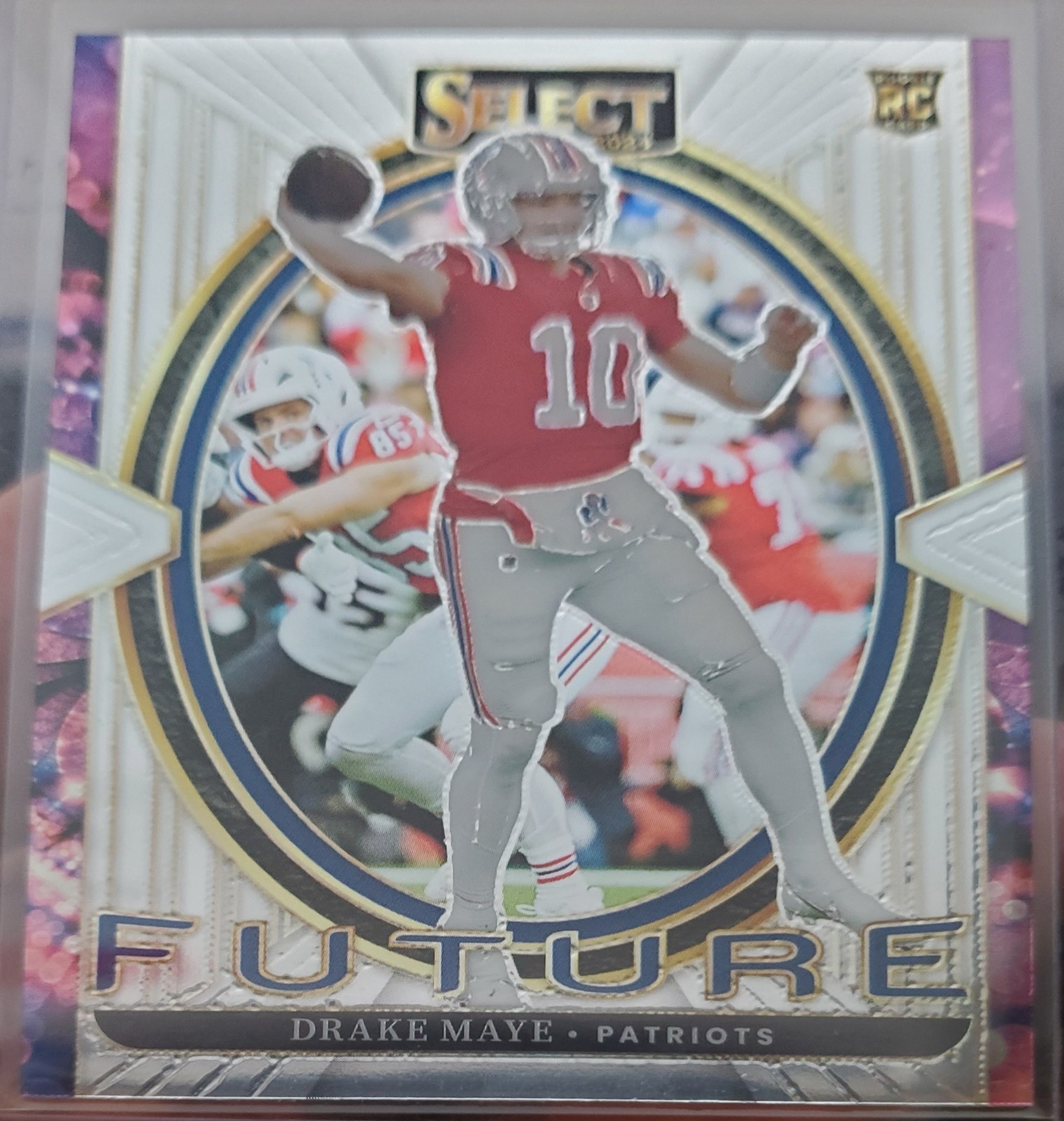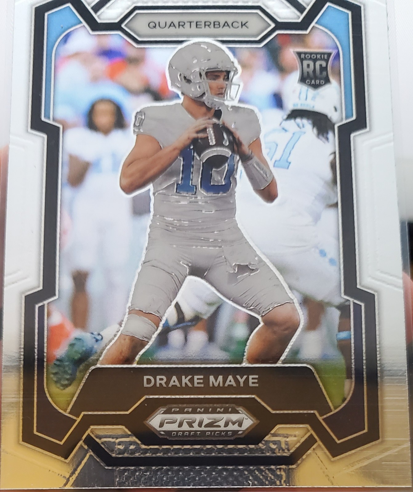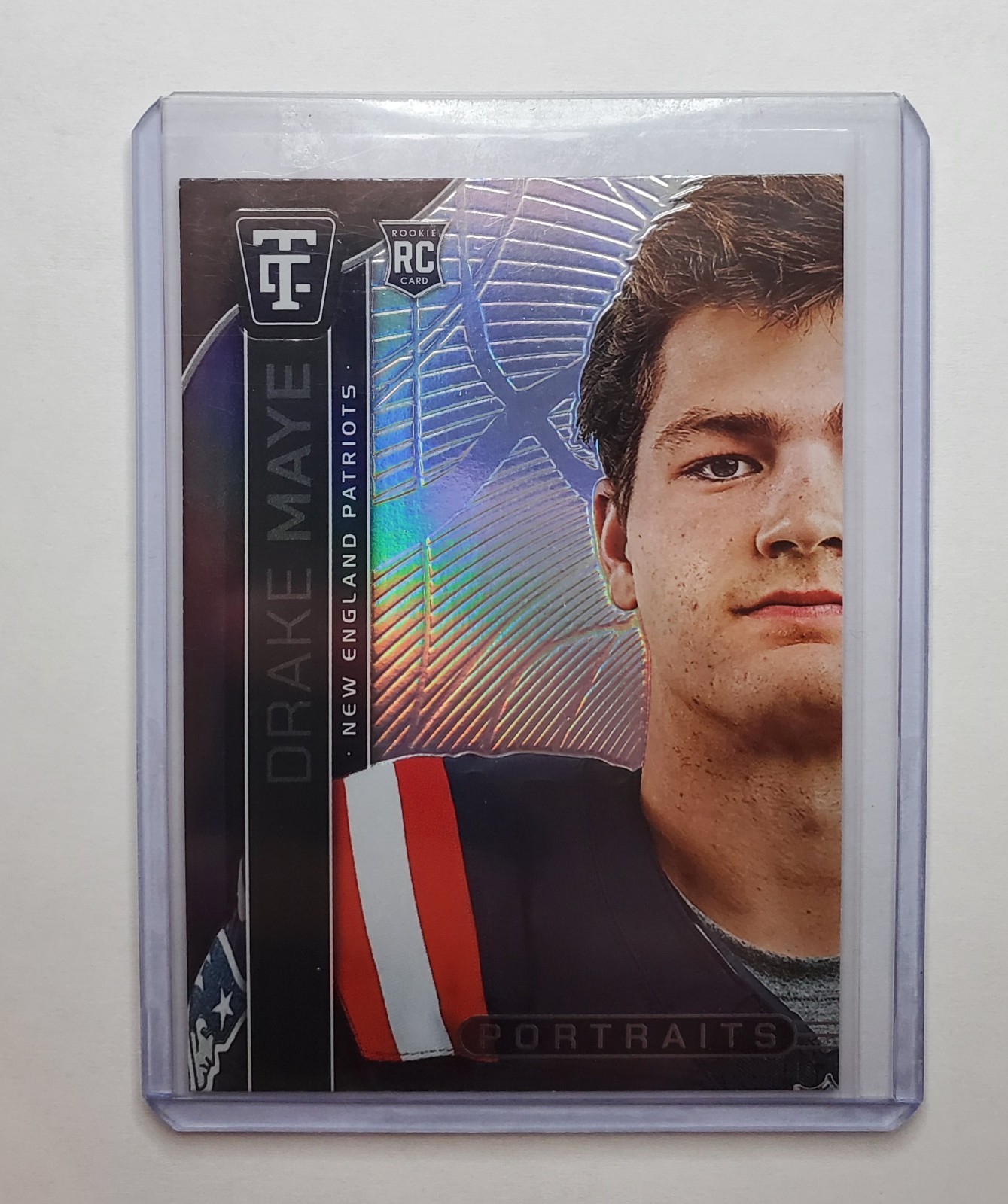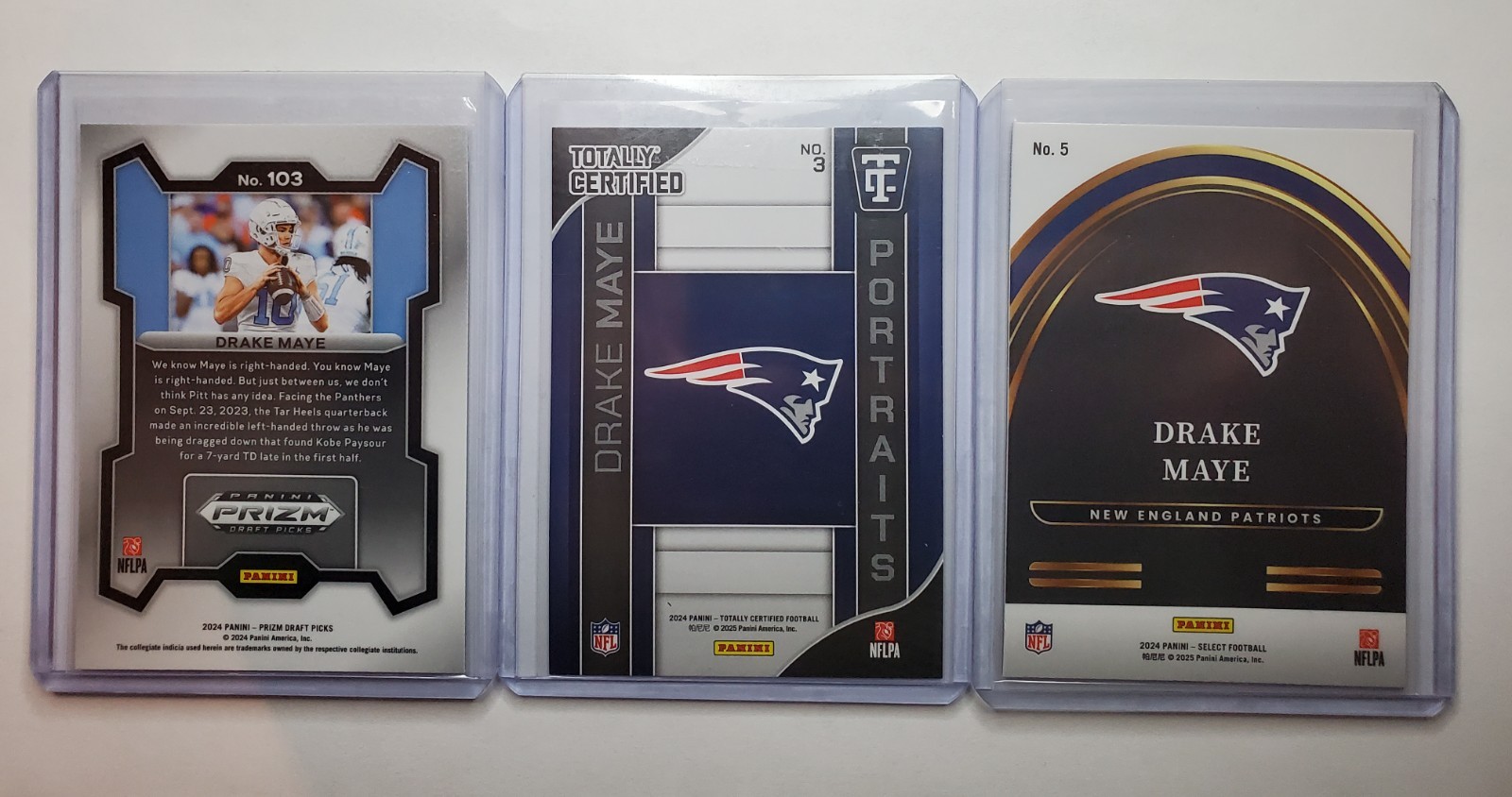 The product is a lot of three 2024 Drake Maye rookie cards featuring portraits, prizm, and futures designs. These standard-sized sports trading cards are manufactured by Panini and are part of the National Football League (NFL) series. Each card is made of card stock and does not come autographed, with the possibility of using a label or sticker for authenticity. The cards are original, not reprint, and showcase the player Drake Maye from the New England Patriots for the 2024 season, making them a valuable addition for football card collectors. (44, 45, 46)