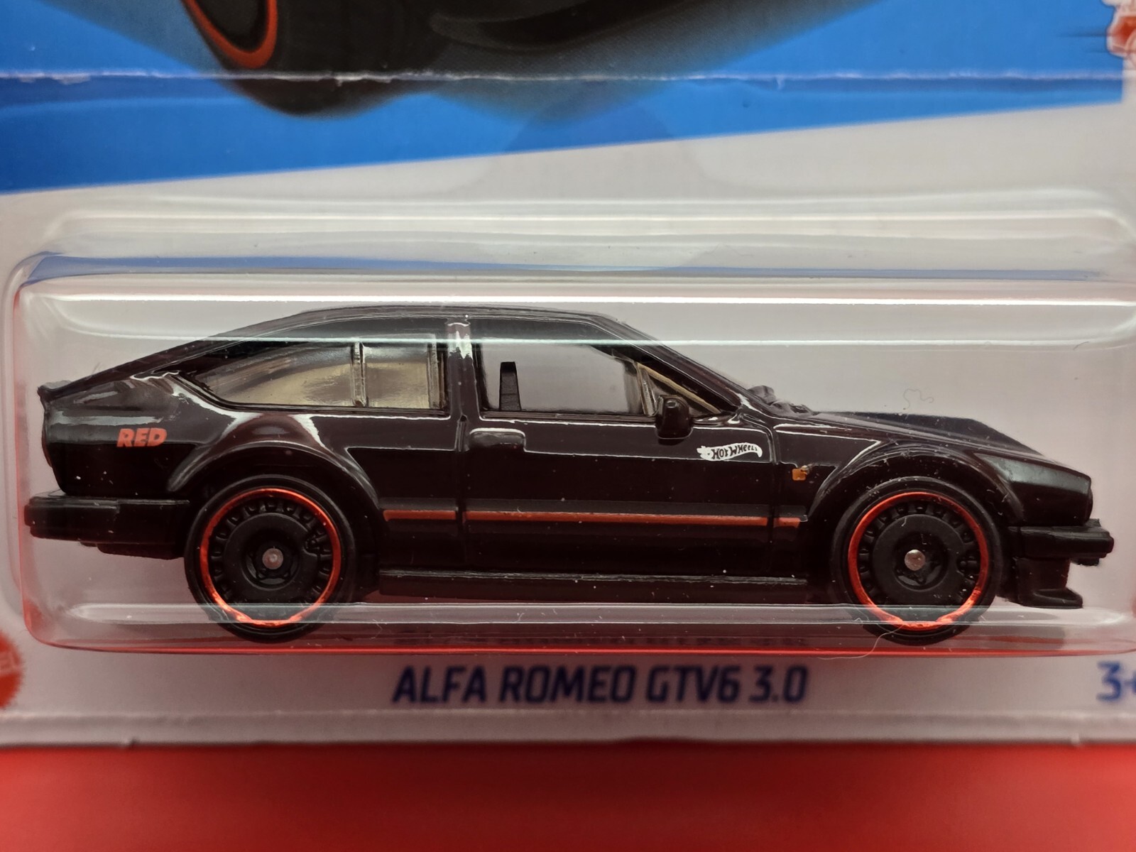 The product is a 1:64 scale Hot Wheels diecast car, specifically the Alfa Romeo GTV6 3.0 model from 1974. It is part of the Hot Wheels Red Edition series and is a Target Exclusive in a black color. This special edition vehicle is a limited edition with advertising specimen features, and comes in an unopened box. Suitable for boys and girls ages 3 and up.