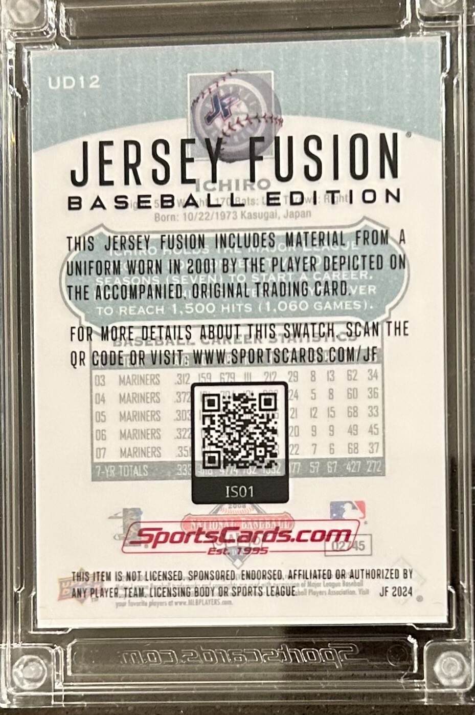 2024 Jersey Fusion Baseball - 2 game used rookie swatches from 2001 for Ichiro Suzuki! The 2 swatches are fused with 2008 Upper Deck Baseball Card that is serial numbered 38/75! Card comes in a sealed one-touch with a QR code on the back that once scanned gives you all the information about when the mem patches were used.