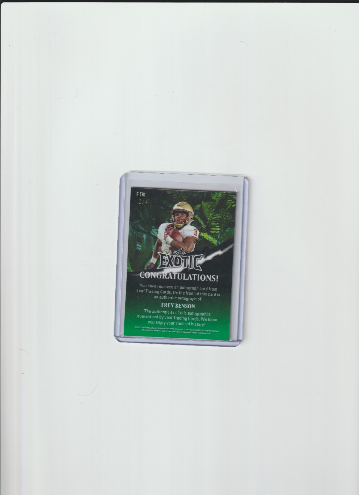 This card is an absolute gem for any collector! The Exotic Tiger Refractor design makes it pop, and Trey Benson’s autograph adds serious value. Super rare with only 4 copies—owning 2/4 feels special. Condition is flawless, and Leaf’s quality shines. A must-have for NCAA football fans and trading card lovers!