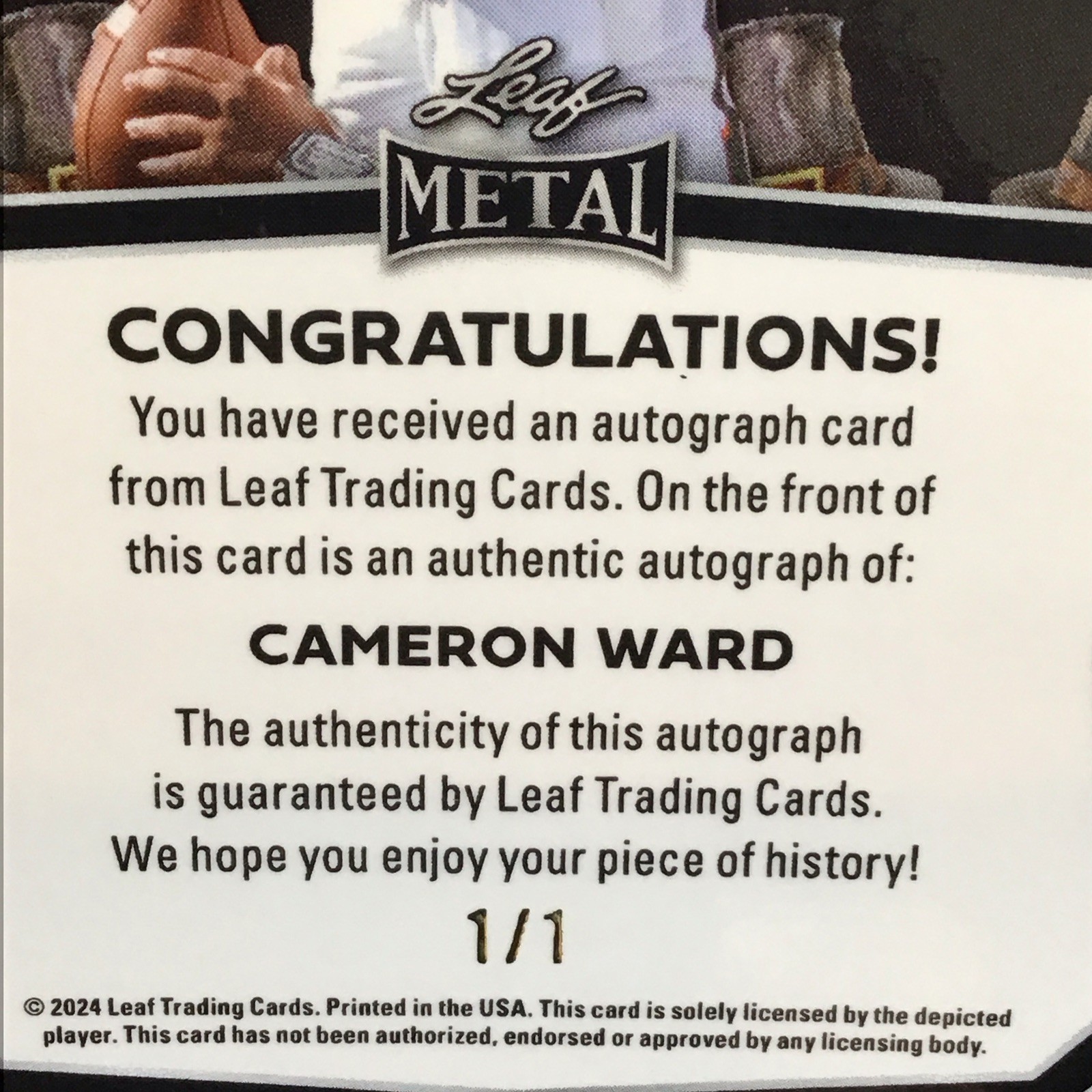 The 2024 Leaf Metal Cameron Ward 1/1 Thanksgiving Day Autograph trading card is a unique and rare collectible item featuring an autograph from the player himself. This card is part of the 2024 Leaf Metal set and is autographed with a label or sticker. The card is serial numbered 1/1, making it a one-of-a-kind piece for fans of the Tennessee Titans and Florida Gators football teams. With its exclusive Thanksgiving Day parallel variety and limited edition status, this card is a must-have for any football card collector.