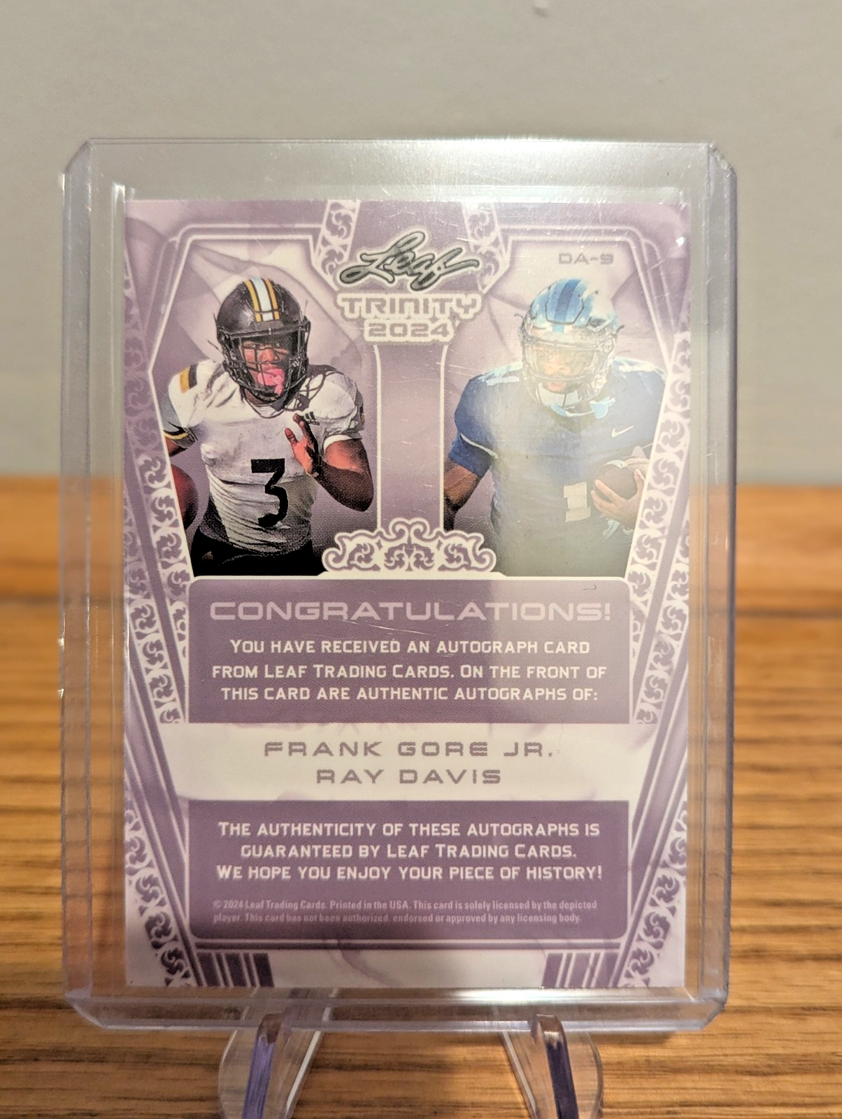 Elevate your sports memorabilia collection with the 2024 Leaf Trinity Football Black Foil Dual Rookie Auto card, featuring the signatures of Frank Gore Jr and Ray Davis. This exclusive card, numbered #3 out of just 5, captures the essence of the athletes' promising careers with a striking purple foil design that sets it apart from the ordinary. A must-have for fans and collectors alike, this card commemorates the talents of both players with its serial numbering and autograph authentication by Leaf. Rooted in the proud legacies of the Southern Miss Golden Eagles, Buffalo Bills, and Northwestern Wildcats, this card is a tangible piece of football history that celebrates the NCAA's finest.
