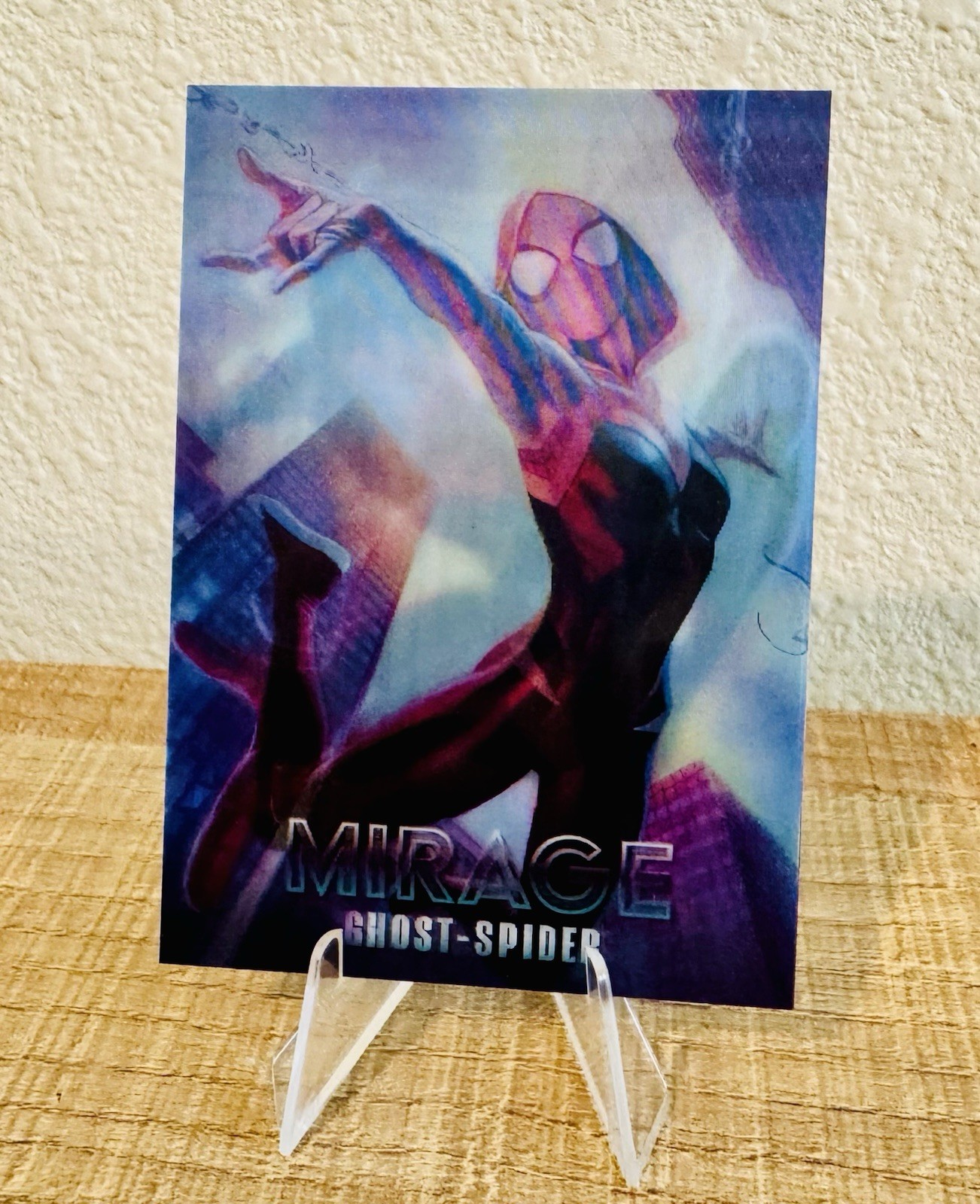 This rare 2024 Marvel Masterpieces trading card features three of the most popular characters in this set. This card includes original art by Nahuel Grego of Spider-Man, Ghost Spider, and Miles Morales of the Spider-Verse. It is a mirage/lenticular styled card. Card was placed directly into a sleeve and toploader.