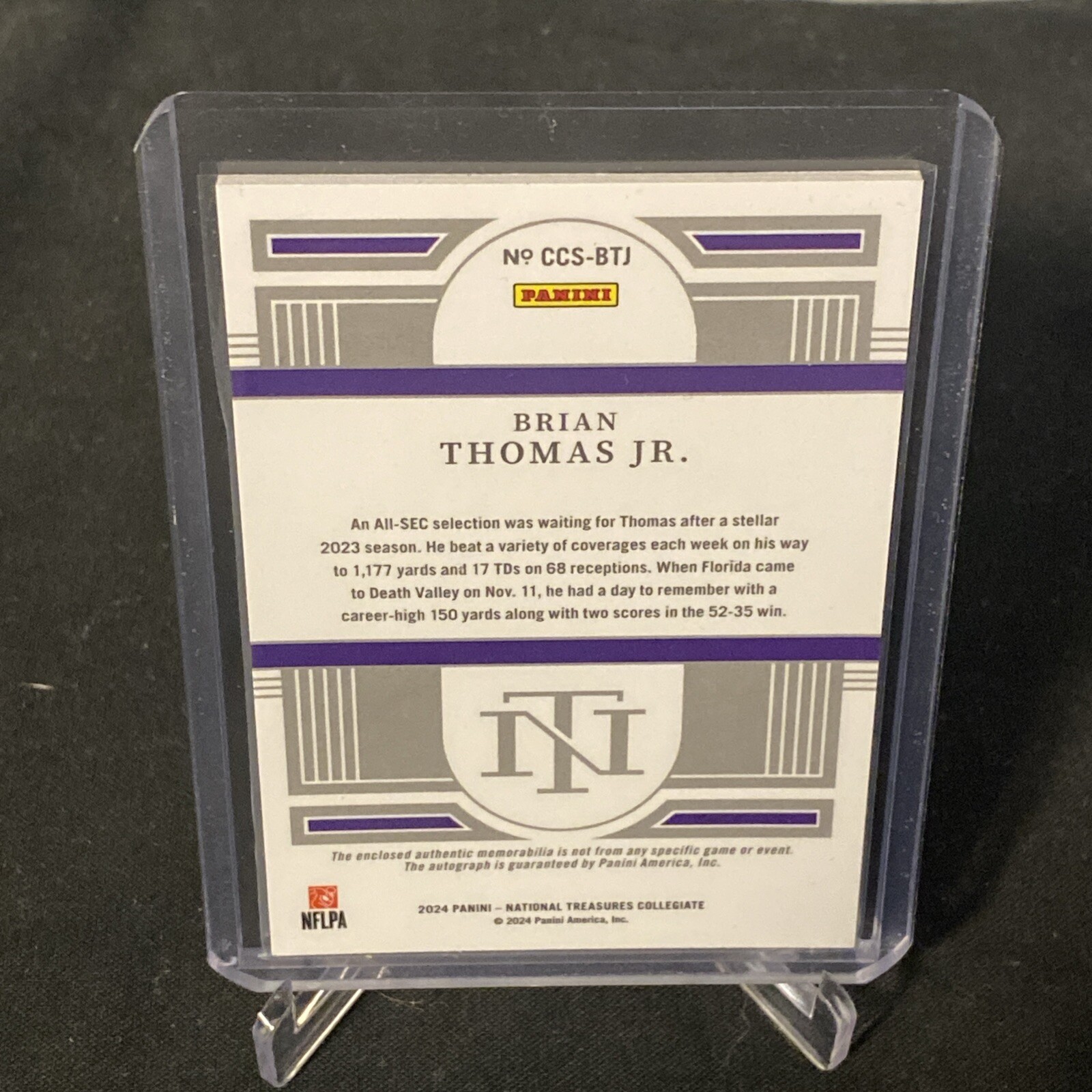 This is a 2024 National Treasures Collegiate football trading card featuring Brian Thomas Jr., a player for LSU Tigers and Jacksonville Jaguars. The card is an autographed Rookie Patch Auto (RPA) with a patch parallel/variety, numbered out of 39. Manufactured by Panini, the card is in excellent condition. This collectible item is a valuable addition for fans of Brian Thomas Jr. and football card enthusiasts alike.