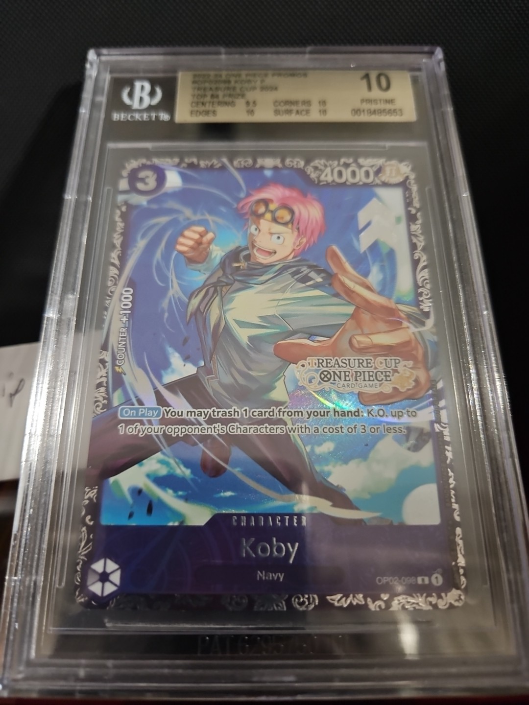 The product is a 2024 One Piece promo treasure cup top 64 Koby #098 card graded as a BGS 10 PRISTINE. This highly collectible card is from the One Piece CCG game and features a foil finish, making it a sought-after item for fans and collectors alike. Manufactured by Namco and authenticated by Professional Sports Authenticator (PSA), this card is a valuable addition to any collection, especially for those interested in rare and promotional items from the One Piece franchise.