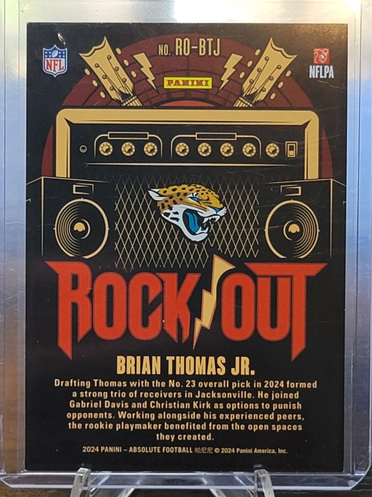 Elevate your football card collection with the 2025 Panini Absolute Brian Thomas Jr. Rock Out RC #RO-BTJ. This sports trading card, featuring the promising rookie, is a must-have for enthusiasts and fans of Brian Thomas Jr. With its eye-catching design, it's a standout piece from the 2025 Panini Absolute set. Crafted by the renowned manufacturer Panini, this card captures the essence of the athlete and the spirit of the sport. Ungraded, it presents an opportunity for collectors to appreciate or seek professional grading for potential added value. A noteworthy addition to any collection, it commemorates Brian Thomas Jr.'s burgeoning career in football.