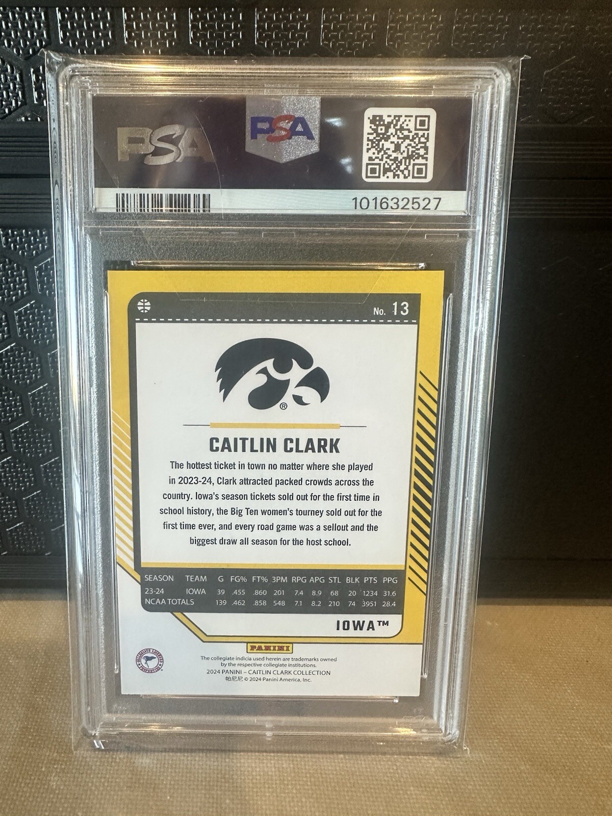 A 2024 Panini Caitlin Clark Collection sports trading card featuring rookie player Caitlin Clark from the Iowa Hawkeyes basketball team. This Donruss card is graded as a PSA 9 and is part of the base set. The card is made of card stock and was manufactured in the United States. It does not have an autograph and is not considered vintage.