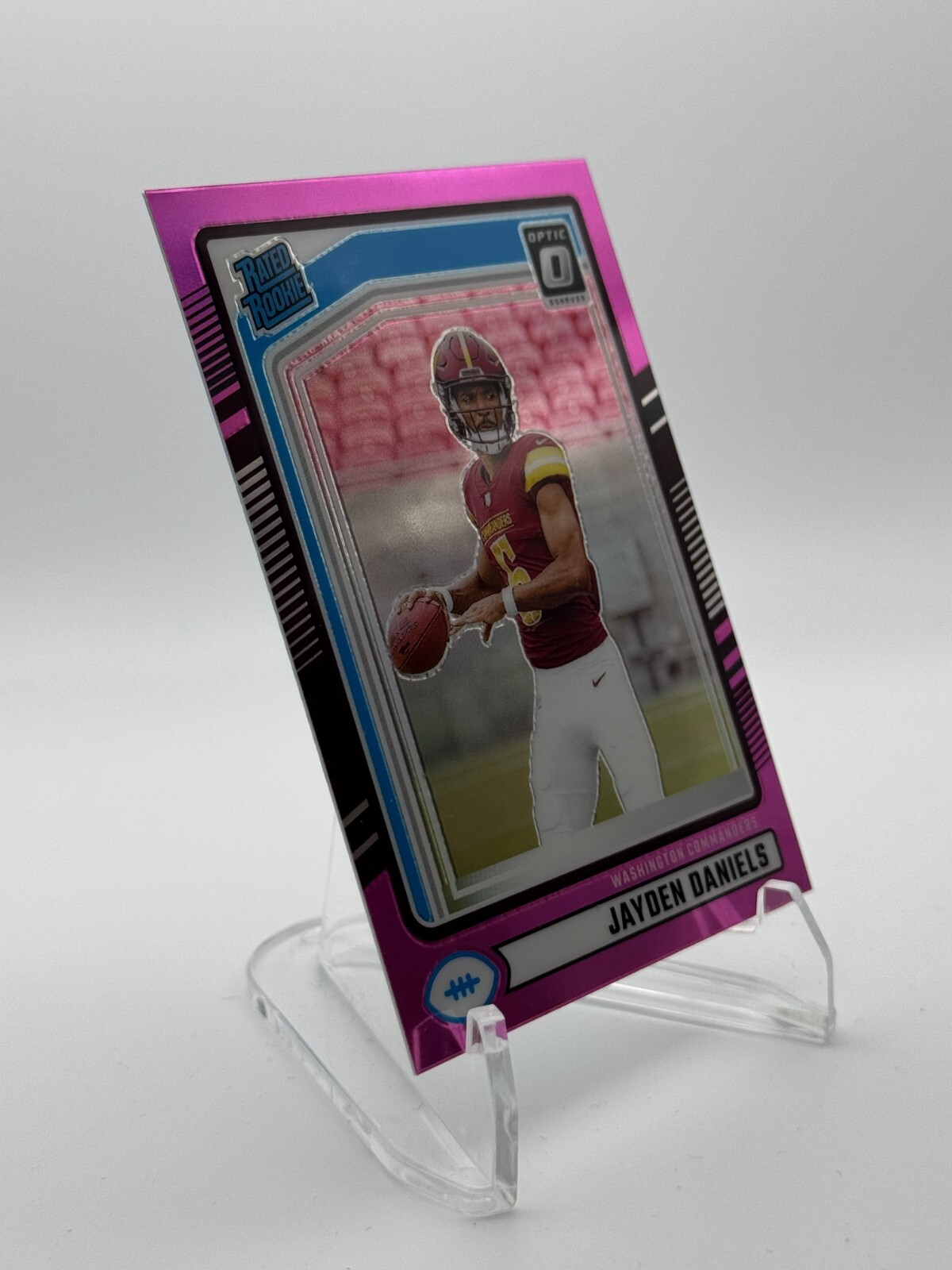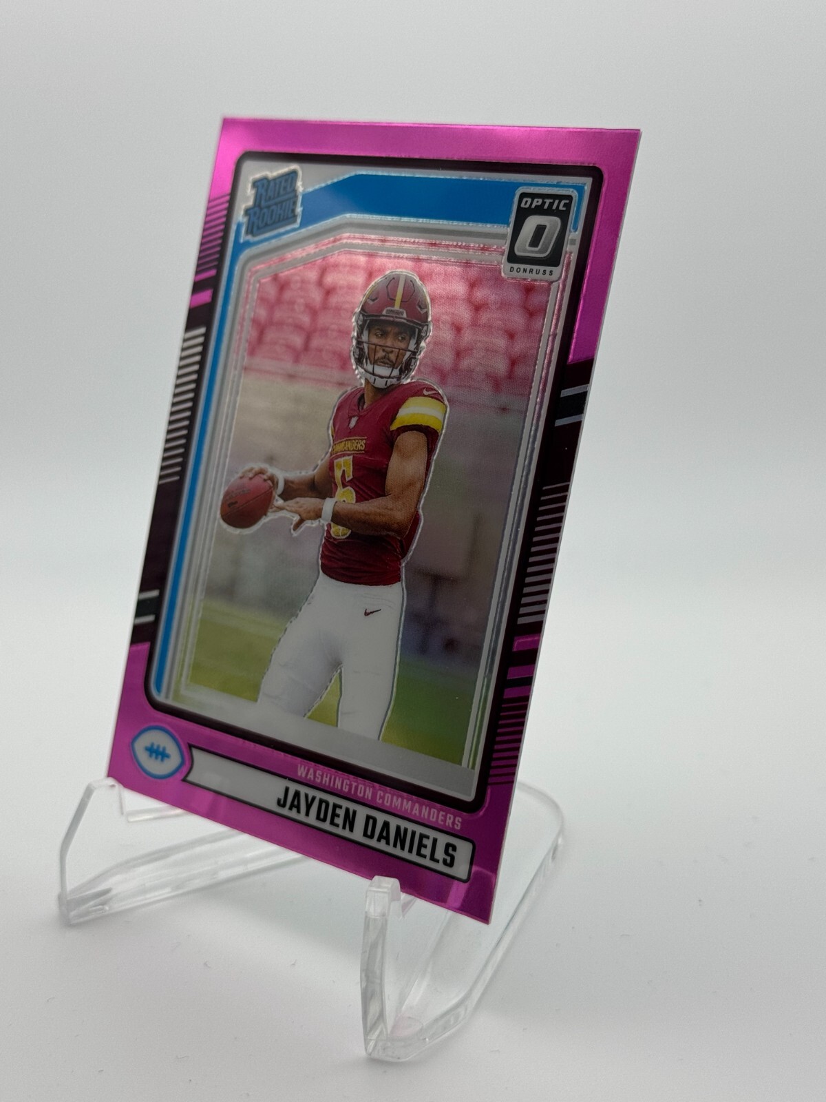 Dive into the 2024 football season with the Panini Donruss Jayden Daniels #389 Rated Rookie Optic Preview Pink Prizm card. This collector's piece showcases the potential of the Washington Commanders' emerging talent, capturing the excitement of the National Football League. This eye-catching card is part of the revered 2024 Panini Donruss set and features the coveted Optic Preview Pink Prizm parallel, adding a distinct shimmer to your collection. A must-have for fans and collectors alike, it celebrates Jayden Daniels as he makes his mark in the football world.