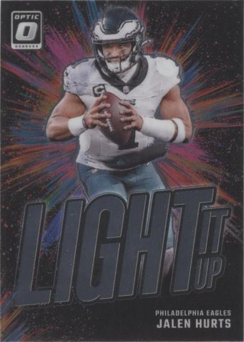 The 2024 Panini Donruss Optic Jalen Hurts Light It Up Insert #19 is a sports trading card featuring the Philadelphia Eagles quarterback. This card is part of the 2024 set and showcases a dynamic design with the "Light It Up" theme. As a base parallel variety, it offers collectors a unique addition to their collection, capturing a key moment in the NFL season for one of the league's brightest stars. With a focus on football and a near mint or better condition, this card is a must-have for fans and collectors alike.