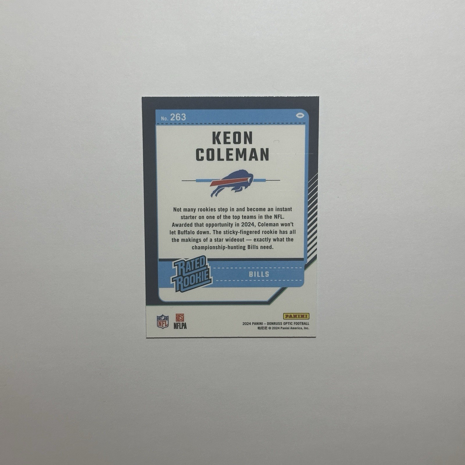 Elevate your football card collection with the 2024 Panini Donruss Optic Rated Rookie card featuring up-and-comer Keon Coleman. As card #263 from the base set, this collectible spotlights the Buffalo Bills' promising talent in his rookie season. A must-have for fans and collectors alike, this card captures the essence of Coleman's athletic potential in the National Football League. Crafted by renowned manufacturer Panini, this sports trading card is part of a highly sought-after series. The 2024 Donruss Optic series is known for its sharp aesthetics and premium finish, making it a standout addition to any NFL collection. Whether you're a supporter of the Bills or an enthusiast of football memorabilia, this card is a tangible piece of the sport's rich tapestry.
