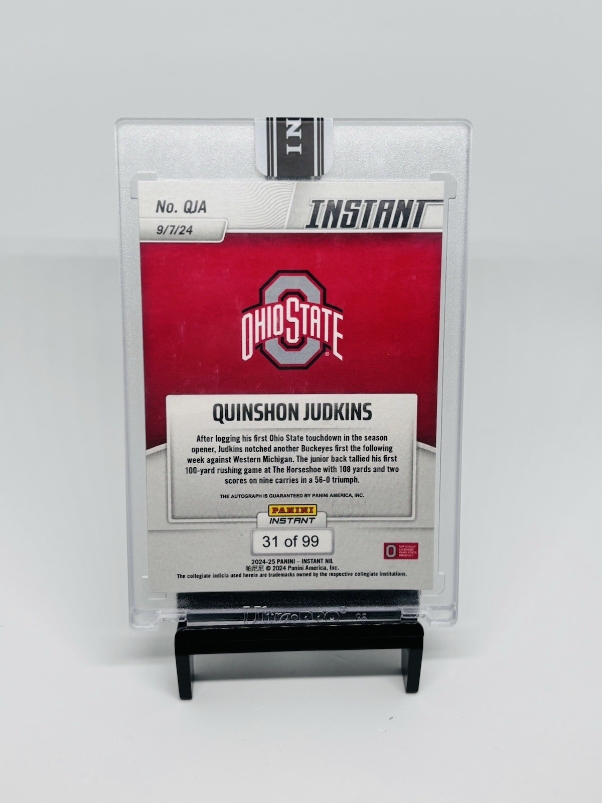 The 2024 Panini Instant NIL Quinshon Judkins Rookie Card features an autograph from Quinshon Judkins, who is associated with the Ohio State Buckeyes football team. This silver parallel card is a short print, making it a more limited edition collectible item. The autograph authentication is done by Panini Authentic, adding to the authenticity of the signed card. This card is part of the National Collegiate Athletic Association (NCAA) and National Football League (NFL) leagues, specifically highlighting Judkins' affiliation with Ohio State University for the 2024 season.