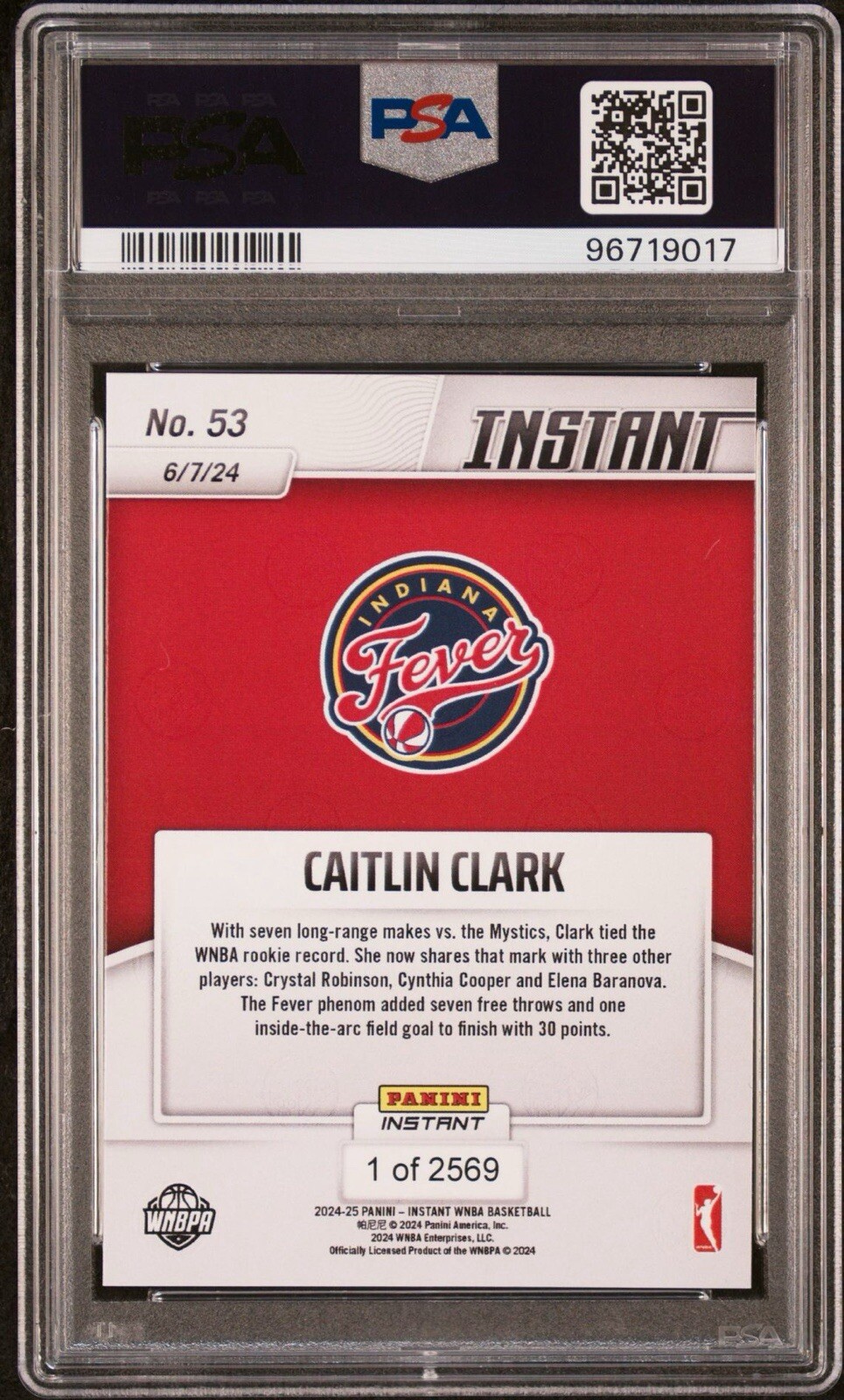The product is a 2024 Panini Instant WNBA trading card featuring Caitlin Clark of the Indiana Fever. This card is a rookie card with a card number of 53 and is part of a set limited to 2569 copies. Manufactured by Panini America, Inc., this card is a PSA 10 graded rookie RC COMMANDERS, indicating it has received a high grade for its condition and authenticity. It is a valuable collectible for fans of the WNBA and Caitlin Clark.