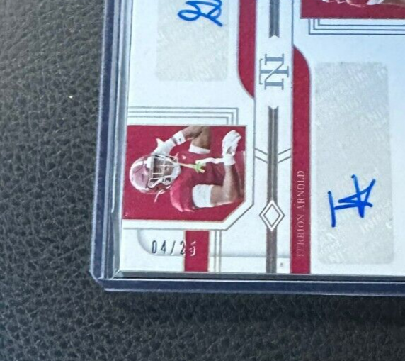 This dual autograph card is an absolute gem for any collector! The stunning silver design, limited to only 25 copies, makes it a rare and valuable piece. Featuring Alabama stars Kool-Aid McKinstry and Terrion Arnold, it’s perfect for fans of college football or NFL rookies. The signatures are crisp, and Panini Authentic ensures its legitimacy. A must-have for serious collectors—this one’s a touchdown!